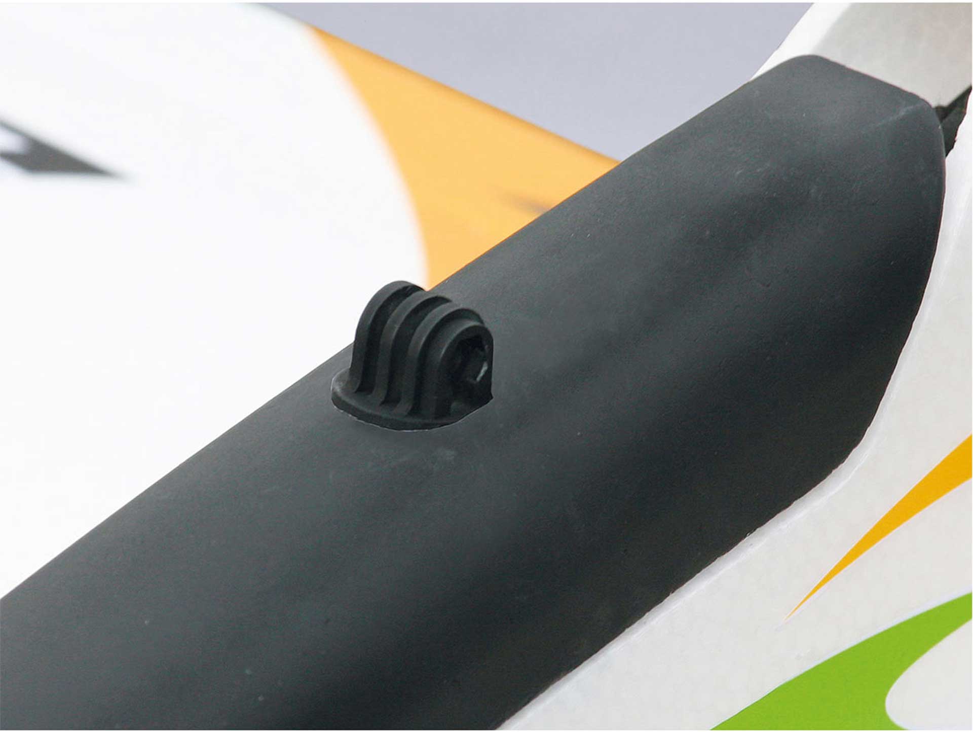 Die Trägermechanik wird im vorderen Teil des Rumpfes an den Seitenwänden eingeklebt. In der Kabinenhaube muss eine kleine Aussparung vorgenommen werden, so dass der Kameraträger herausragt. Die Kamera selbst wird in den Kunststoffhalter eingesetzt und ist über ein Snaplock System gesichert. Nach dem Schließen der Kabinenhaube wird die Kamera mit einer Schraube auf dem Träger befestigt und schon kann es losgehen…