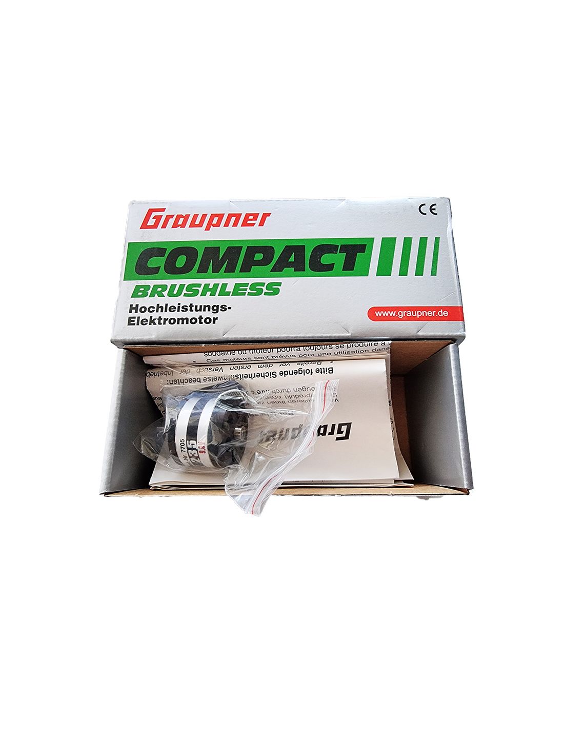 GRAUPNER COMPACT-BRUSHLESS-Motoren. Hochleistungs-BRUSHLESS-Motorenserie. Die Motoren dieser Serie bestechen durch ein enorm hohes Drehmoment. Sie zeigen im Direktantrieb ihr volles Leistungspotential. Die GRAUPNER COMPACT-Motoren sind bürstenlose Außenläufer, d.h. der Motoraußenmantel dreht sich und treibt die Motorwelle an. Dieses Konstruktionsprinzip führt zu besonders kompakten Elektromotoren, die ohne vorgeschaltetes Getriebe hervorragende Leistungswerte erzielen. Ein weiterer Vorteil: das Gewicht der GRAUPNER COMAPCT-Motoren ist im Vergleich zu konventionellen Motoren sehr gering.