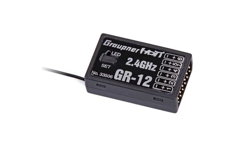 Der Graupner GR-12 HoTT Empfänger verfügt über ca. 2000m Reichweite und kann mit bis zu 6 Kanälen belegt werden.