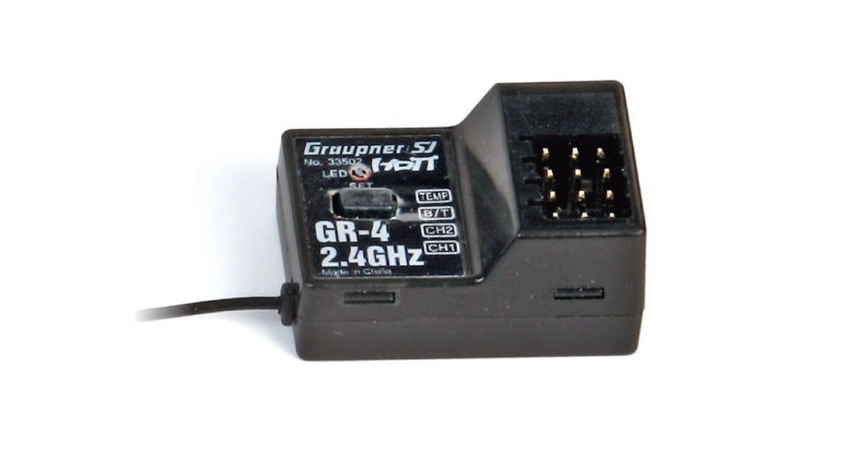 Der Graupner GR-4 ist ein HoTT Empfänger mit einer Reichweite von etwa 500m, der mit bis zu 2 Kanälen belegt werden.