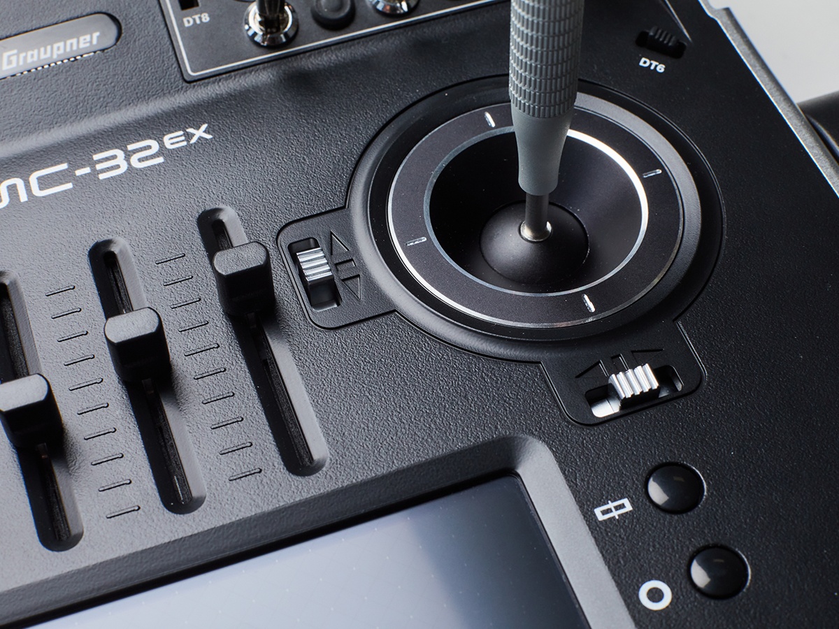 Der Sender lässt sich auch mit 4D-Knüppeln ausstatten. Einer der beiden 4D-Geber wird dann allerdings anstelle des oberen walzenförmigen Drehgebers im Sender angeschlossen, der stattdessen an einem beliebigen anderen freien Steckplatz angeschlossen werden kann.