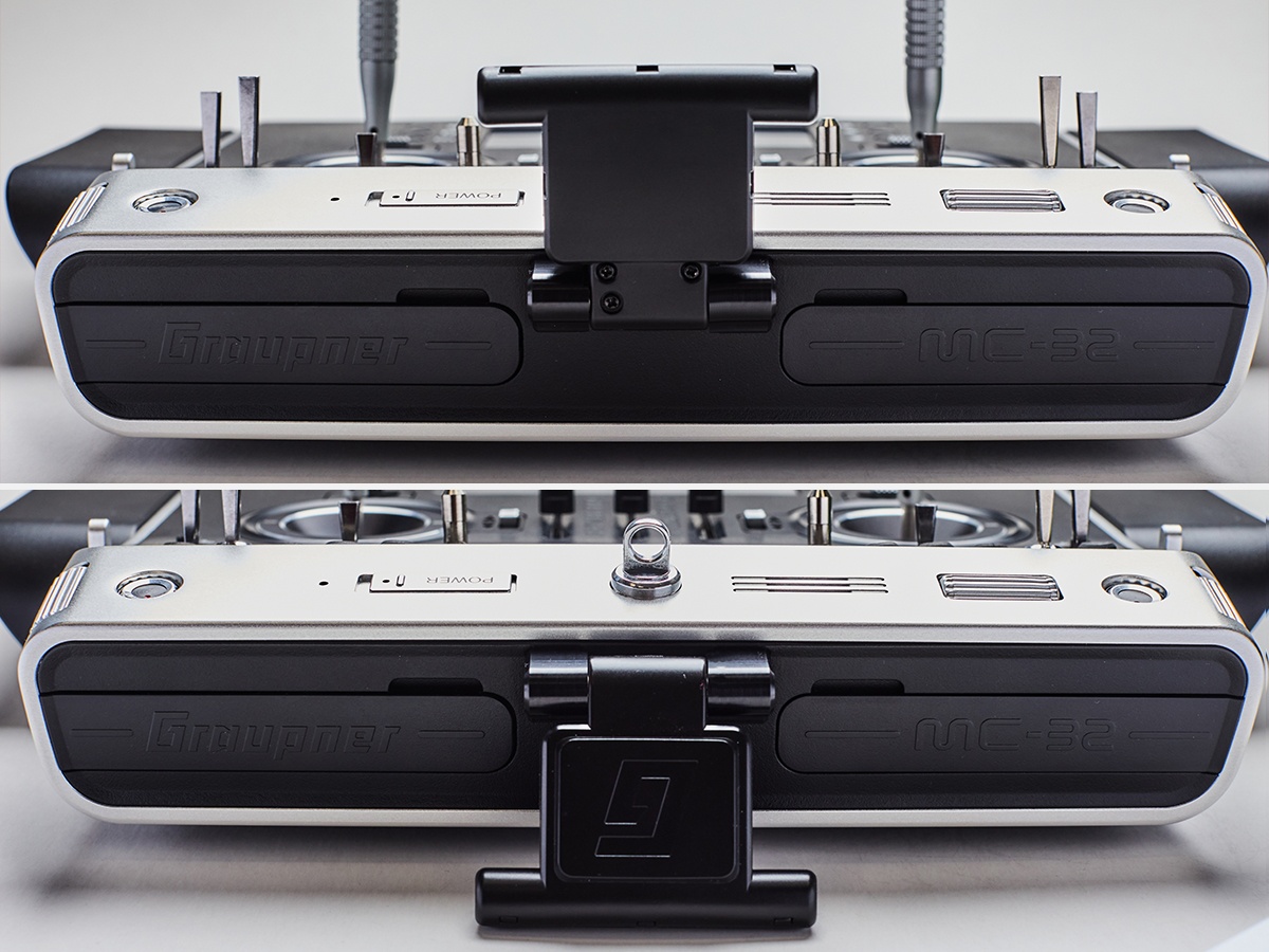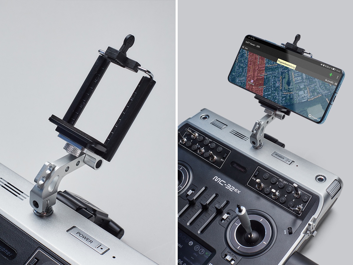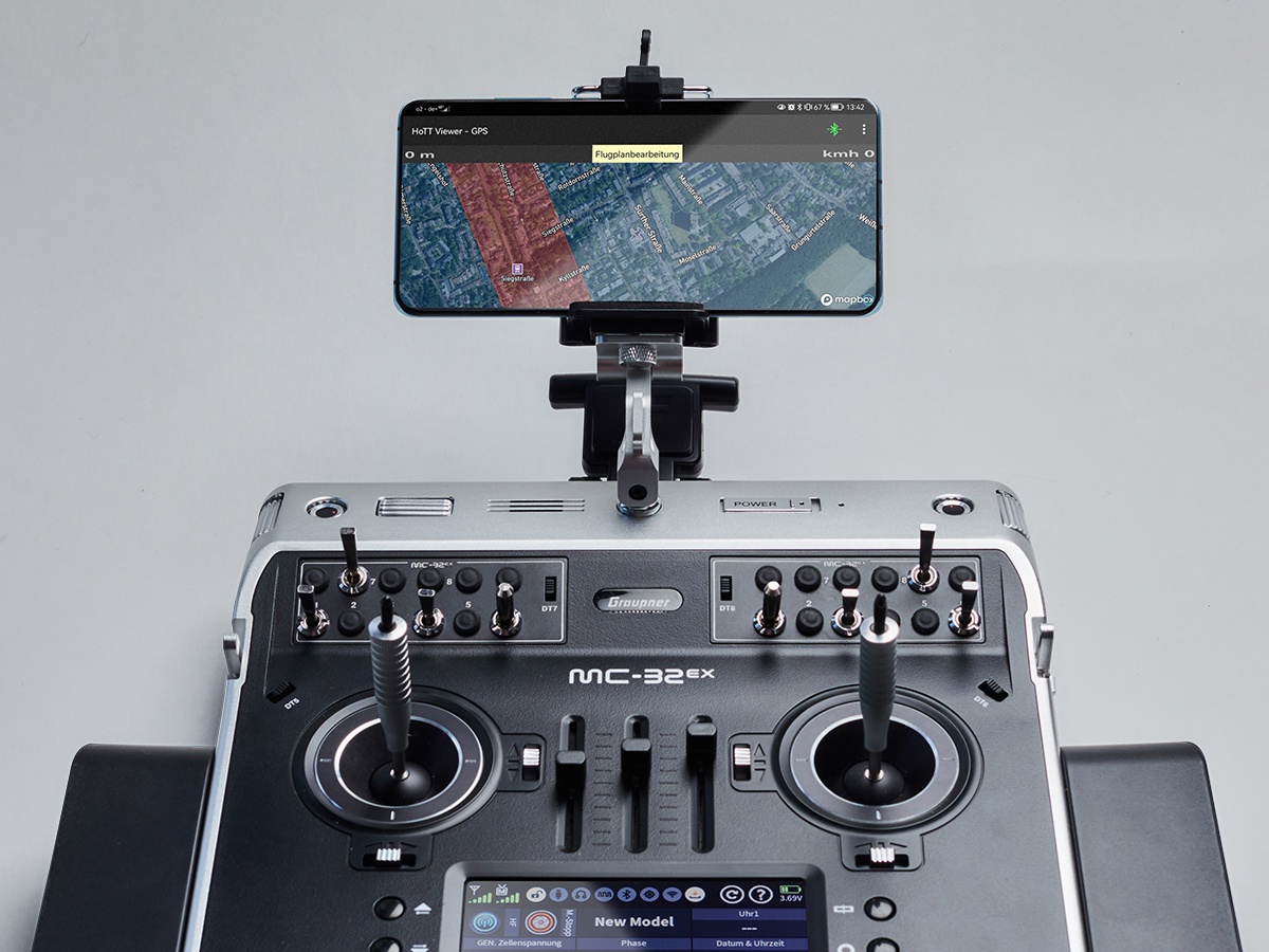 Du brauchst mehr Daten im Blick? Vieles in unserem Alltag läuft über das Smartphone. Wir bieten Dir die Möglichkeit Dein Smartphone in Dein RC-Erlebnis zu integrieren. Am oberen Rand des Aluminium-Rahmens befindet sich eine Metallhalterung, an der ein optional erhältlicher Smartphone-Halter befestigt werden kann. Ist Dein Smartphone sicher eingesetzt und per Bluetooth oder USB-Kabel verbunden, kannst Du während der RC-Action wichtige Daten über die Graupner-HoTT-Viewer-App ablesen. Das Smartphone ist so am Sender positioniert, dass Deine Augen nicht mehr so weit von Deinem Modell abweichen müssen. Durch den steilen Blickwinkel auf das Handy ist das Display auch bei direkter Sonneneinstrahlung noch ideal abzulesen. Die optionale Handy-Halterung löst das altbekannte Mini-Display am oberen Rand unserer alten Pultsender-Generationen ab. In der Praxis und zahlreichen Tests mit Modellbauern hat sich herausgestellt, dass dieses kleine Display keinen großen Mehrwert geboten hat. Mit Deinem Smartphone erhältst Du ein größeres, besser ablesbares und funktionaleres Display dazu.