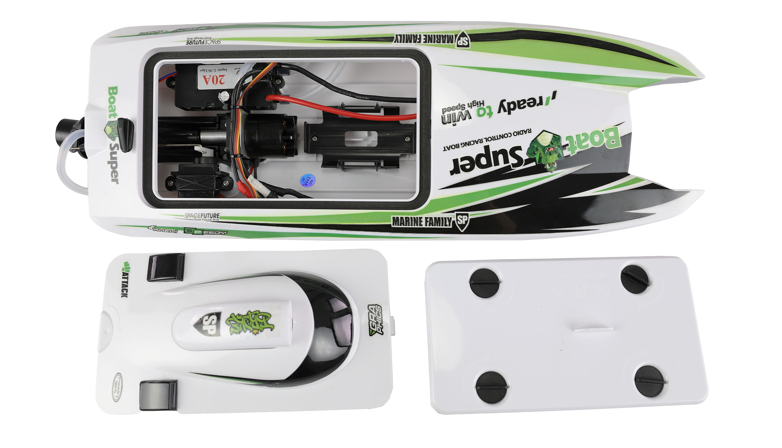 Stell dir vor, du hast ein brandneues Rennboot der Offshore-Klasse, das nicht nur durch sein auffälliges Design besticht, sondern auch mit einem effizienten Jetantrieb ausgestattet ist: Dieses 400mm lange Kraftpaket erreicht Geschwindigkeiten von über 30 km/h und meistert nahezu jede Wasseroberfläche – solange nur ein wenig Wasser unter dem Kiel ist! Der innovative Jetantrieb eröffnet dir mehr Möglichkeiten als ein traditioneller Propellerantrieb, da er Wasser unter dem Boot ansaugt (geschützt durch ein Gitter) und es als komprimierten Strahl am Heck ausstößt, was für enormen Schub und schnelle Beschleunigung sorgt. Der beiliegende 3S 11,1V Li-Ion Akku liefert genug Power für alle deine Manöver, und du kannst sogar auf überschwemmten Wiesen fahren. Äste, Steine oder andere Hindernisse? Kein Problem, dein Rennboot fährt einfach drüber hinweg. Dank der Schubvektorsteuerung, bei der der Antriebsstrahl zur Steuerung genutzt wird, bietet das Boot eine beeindruckende Agilität und Wendigkeit, perfekt für auch die engsten Gewässer. Der Rumpf ist mit einem Schnellverschluss für den Akkuwechsel und einem zusätzlichen Deckel gegen Wasser ausgerüstet. Sowohl der eingebaute Brushless-Motor als auch der Regler sind wassergekühlt, und das zuverlässige 2,4GHz Sendersystem bietet Zusatzfunktionen wie anpassbare Geschwindigkeit und Trimmung, damit du das Boot genau auf deine Bedürfnisse und Fähigkeiten abstimmen kannst.