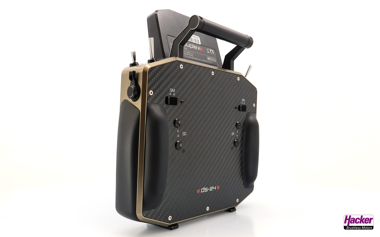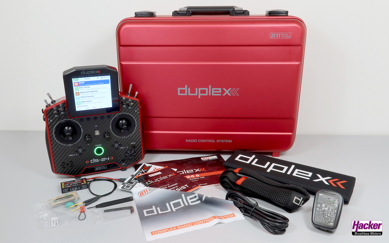 Handsender DS-24 II Carbon Line Bronze eloxiert (Auslieferzustand Mode 2, Steuermode sehr einfach wechselbar), Empfänger REX12 Assist mit Zubehör, Aluminium-Koffer, Senderakku eingebaut, Ladegerät für Senderakku, USB-C Ladekabel, Sendergurt, DUPLEX Pad, Reinigungstuch, Montage-Werkzeug, Bedienungsanleitung