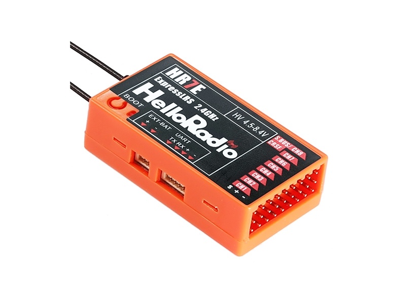 Der HelloRadio HR7E-Empfänger wurde speziell für Flugmodelle entwickelt. Er kann bis zu 8 Servos ansteuern und verfügt über eine eingebaute Empfängerspannungs-Telemetrie und Flugakku-Telemetrie mit der Fähigkeit, automatisch zu erkennen, welcher Spannungseingang zu verwenden ist. Eine CRSF-Schnittstelle erleichtert die spätere Erweiterung der Telemetriesensoren. Der HR8E verfügt über eine Doppelantenne mit einer Telemetrieleistung von bis zu 100mw.