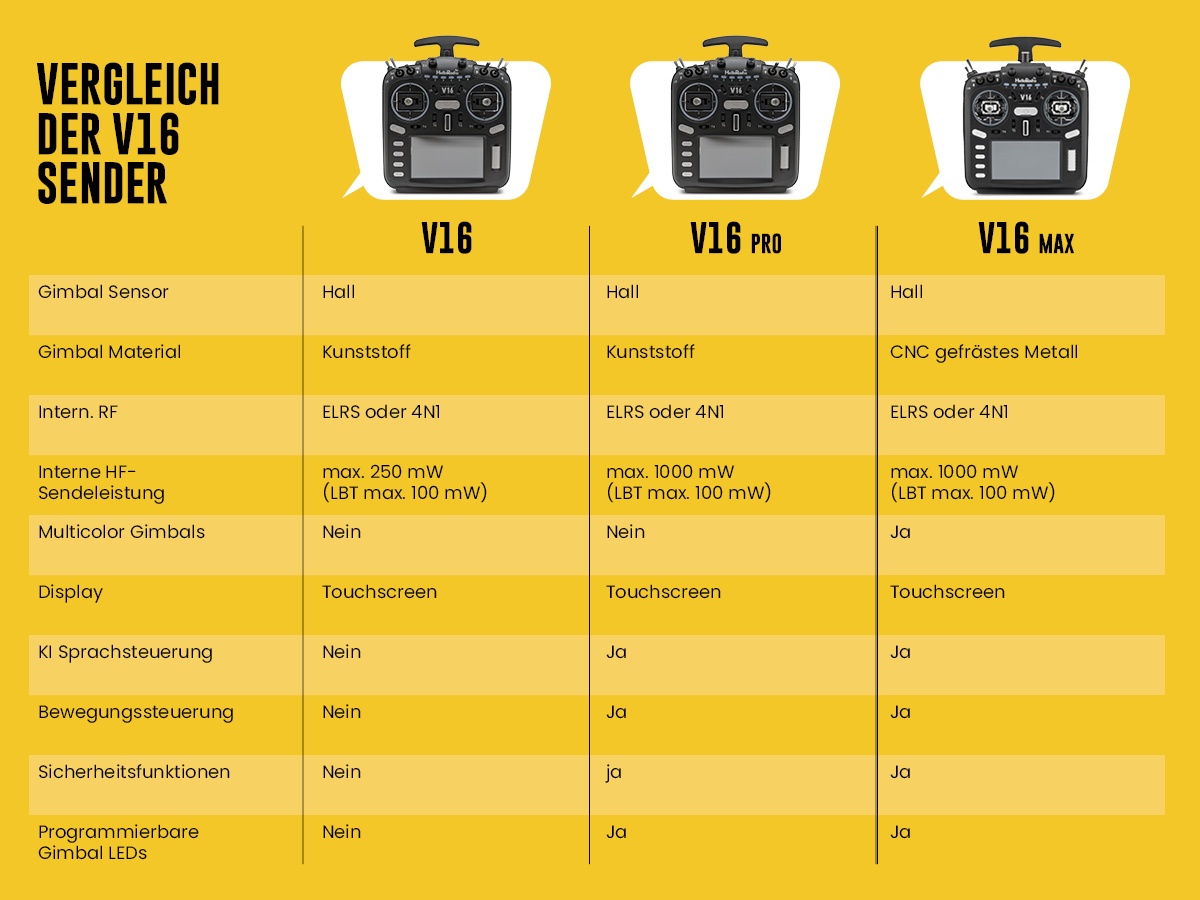 4N1 Funksystem Die V16 MAX wird mit einem internen 4N1 HF-Modul angeboten. Das 4N1 Multiprotokoll Funksystem beinhaltet die HF-Chips NRF24L01, CC2500, A7105 und CYRF6936. Es ist kompatibel mit HoTT, Futaba SFHSS, FrSky, DSM/DSMX, Walkera Devo, FlySky, AFHDS2A, Hubsan, HiSky, Syma und ASSAN Protokollen. Die 4N1 LBT-Version (Europa) ist beschränkt auf LBT-konforme Protokolle HoTT, FrSKY X/X2 LBT, und DSMX.