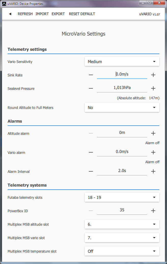 Beispiel: Wenn das Modell mit einer nominalen Sinkrate von 0,5 m / s fliegt, ist das Vario geräuschlos. Sobald das Modell in eine Thermik eintritt, ertönt ein Piepton (obwohl das Flugzeug möglicherweise noch sinkt). - Sealevel Pressure – Der Meeresspiegeldruck wird als Referenz zur Berechnung der absoluten Höhe herangezogen. Um die genaueste Berechnung der Höhe zu erhalten, stellen Sie den Druck an Ihrem Standort auf den Meeresspiegel ein. Das International Standard Atmosphere Model definiert den Meeresspiegeldruck auf 1013 hPa.