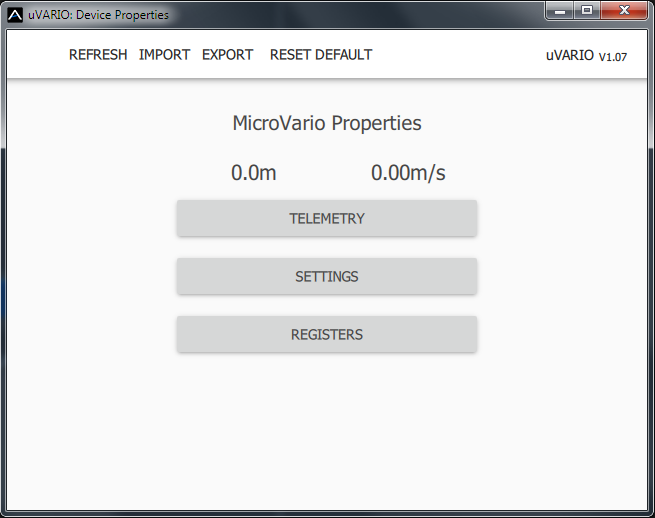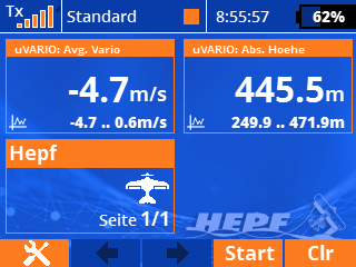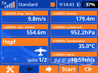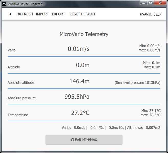 - Actual values – Zeigt die aktuellen Telemetriewerte (Höhe, Variation, Druck, Temperatur) zusammen mit Mindest- und Höchstwerten an.