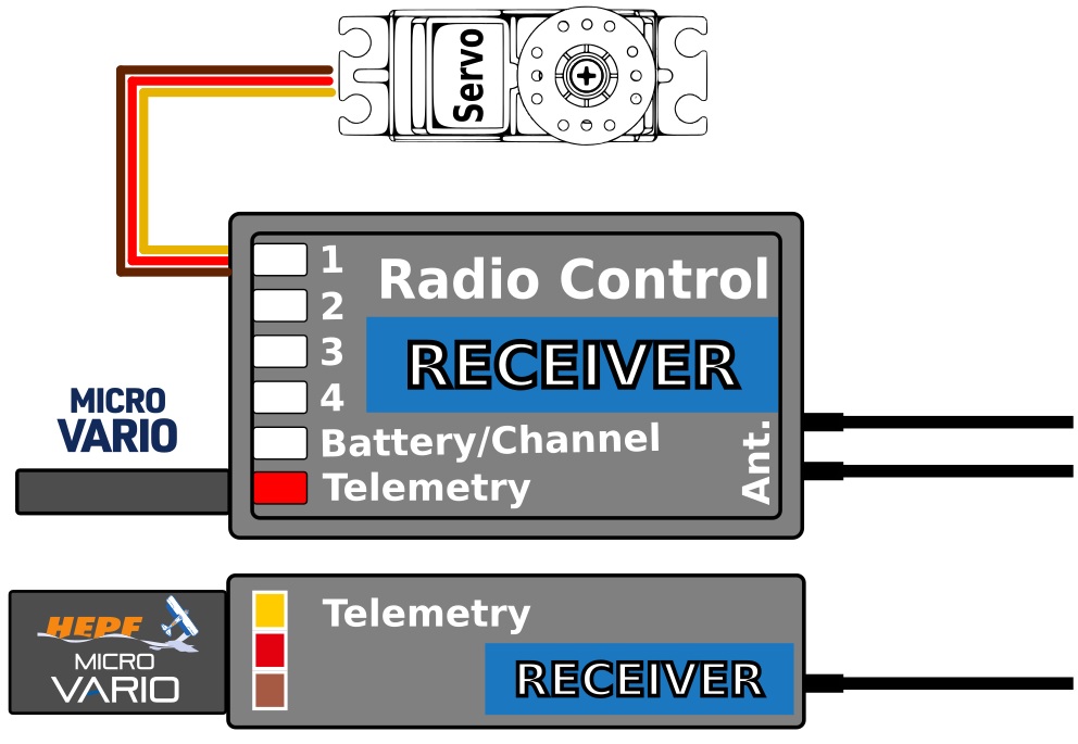 Das Micro Vario wird direkt an den Telemtrieport des Empfängers angesteckt. Alternativ könnte ein Servoverlängerungskabel zwischen empfänger und Micro Vario gesteckt werden