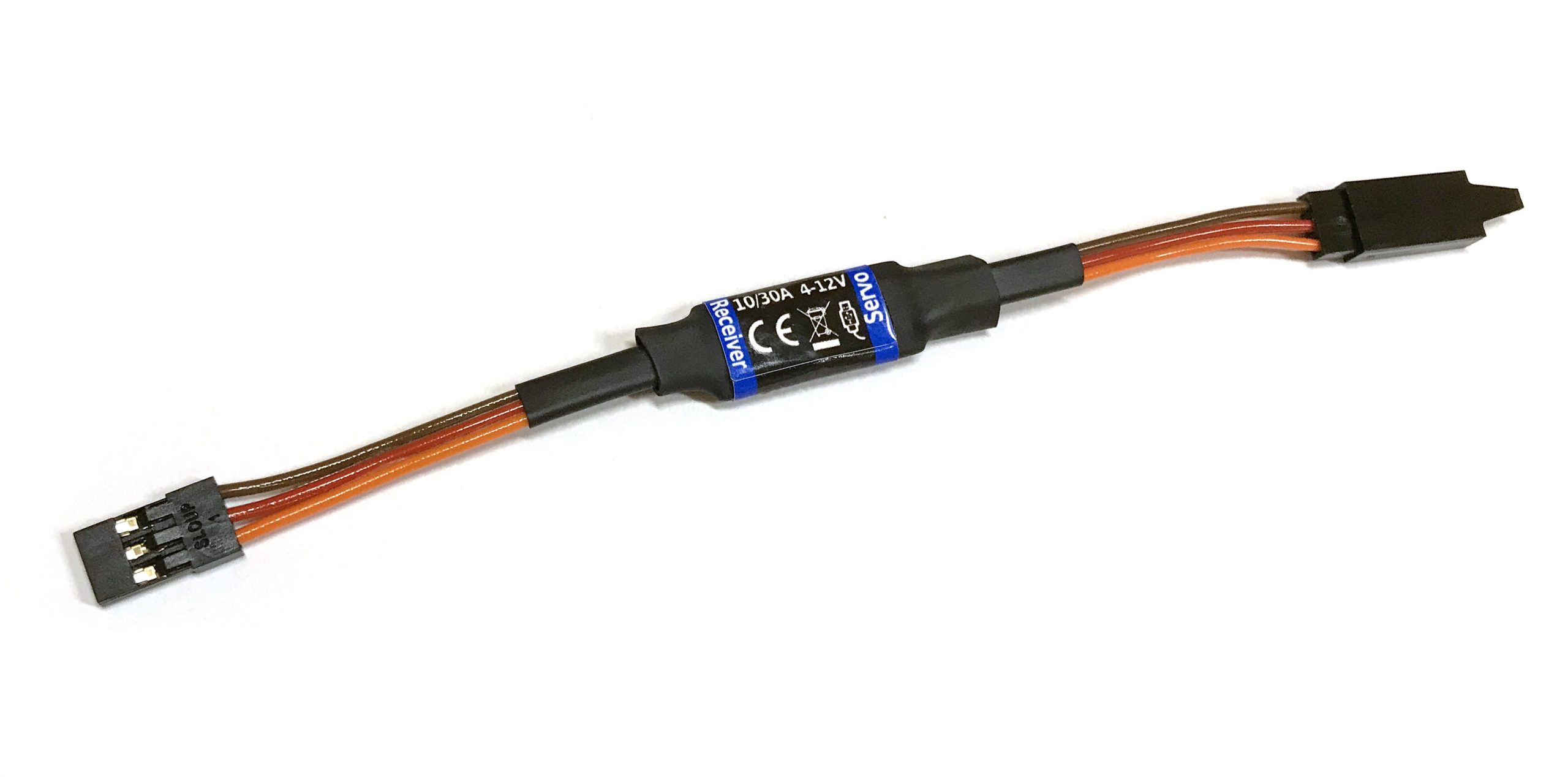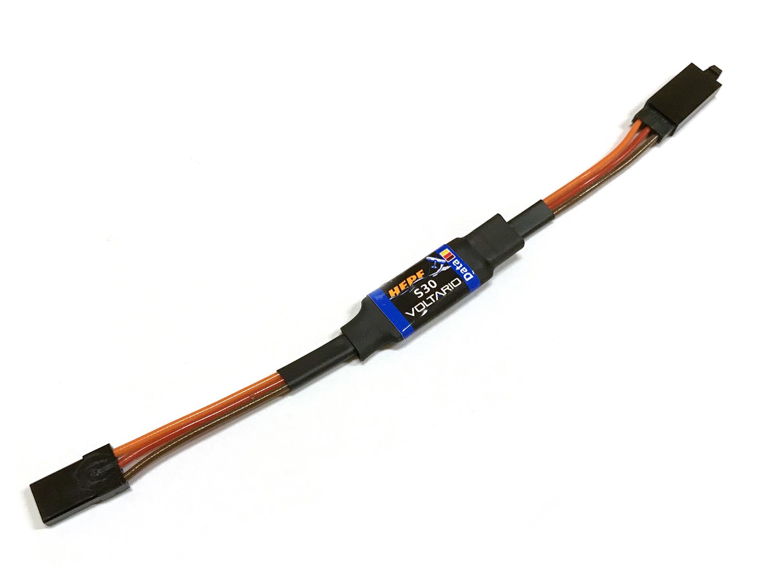 Stecken Sie das Voltario S30 zwischen Empfängerausgangskanal und Servo. Das Voltario S30 arbeitet völlig autonom als programmierbare Sicherung (diese Funktion muss zuerst konfiguriert werden).