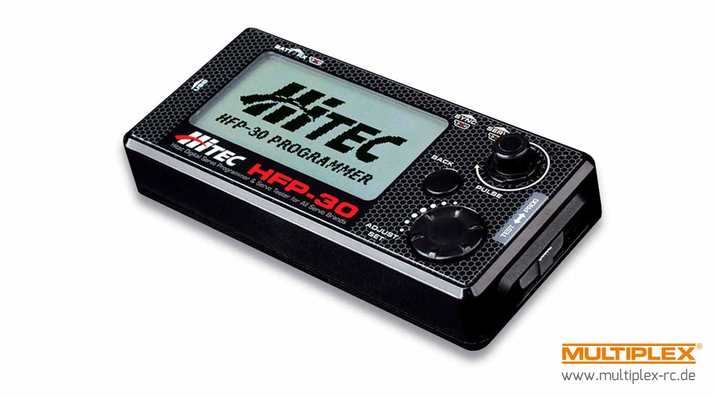 Das digitale Servoprogrammiergerät HFP-30 dient zum Testen und Programmieren von HiTEC Digital-Servos und überzeugt durch geringes Gewicht. Es bietet zahlreiche Funktionen auf dem großen und leicht zu lesenden LCD-Bildschirm. Geeignet für folgende HiTEC-Servos: HS-5XXX, 7XXX, Brushless-9XXX und die neue D-Serie. Betrieb im Spannungsbereich von 4,8 – 8,4V.