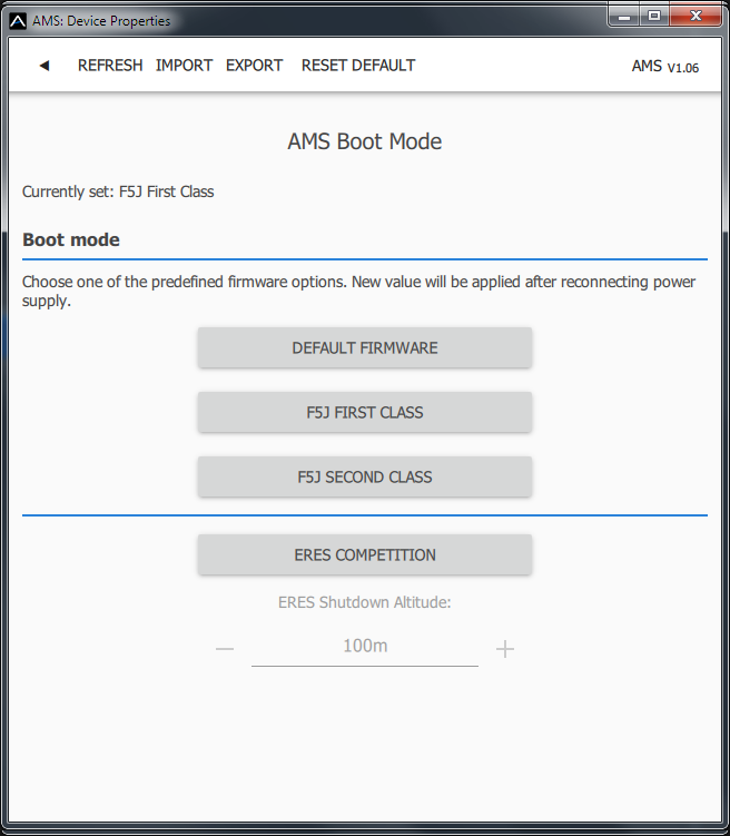 Nach Änderung des Boot-Modus werden alle zuvor aufgezeichneten Flugdaten verworfen und die neue Einstellung wird nach einem Neustart des AMS übernommen.