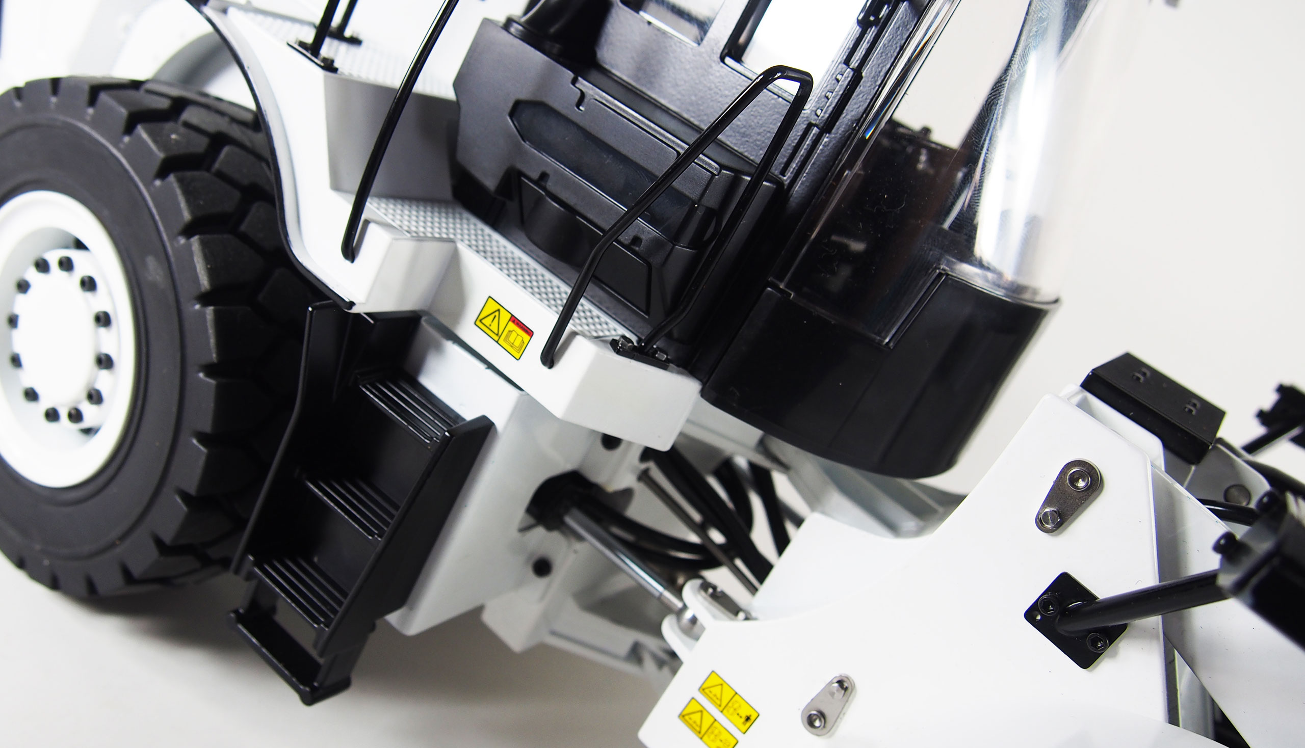 Hydraulik-Scale-Nachbau eines bekannten Radladers in Vollmetall und weißer-Lackierung, der mit sperrbaren Differentialen, 2-Gang-Schaltgetriebe und Pendelachse für ein außergewöhnliches Fahrerlebnis sorgt. Diese ca. 11kg schwere Baumaschine im Maßstab 1:16 lässt sich dank seiner Vollgummireifen auf nahezu jedem Untergrund bewegen. Die Kraft des Auslegers, des Brushless-Antriebes und der hydraulikgesteuerten Schaufel sind im Vergleich zu seinem Eigengewicht überdurchschnittlich stark und ermöglichen ein problemloses Arbeiten auch mit schwerem Material wie Erde, Kies oder anderem Schüttgut.
