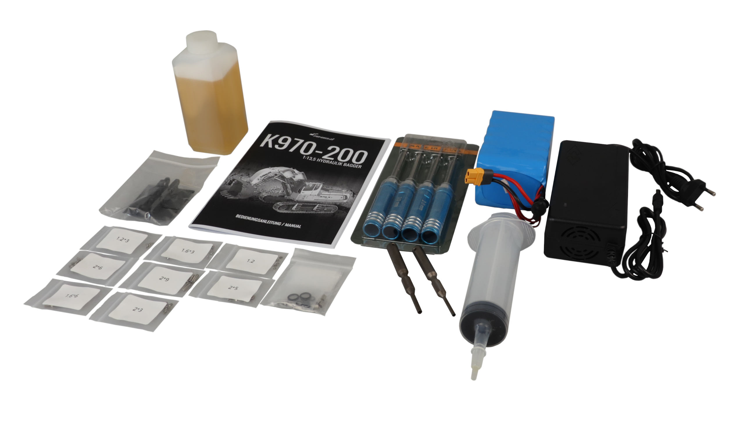 Zur Inbetriebnahme des Baggers muss lediglich der Akku vor der ersten Nutzung noch geladen und das Hydraulik-Öl eingefüllt werden. Dazu werden ca. 200ml des mitgelieferten Öls in den Tank gegeben. Anschließend kann der Spaß mit dem neuen K970-200 sofort losgehen.