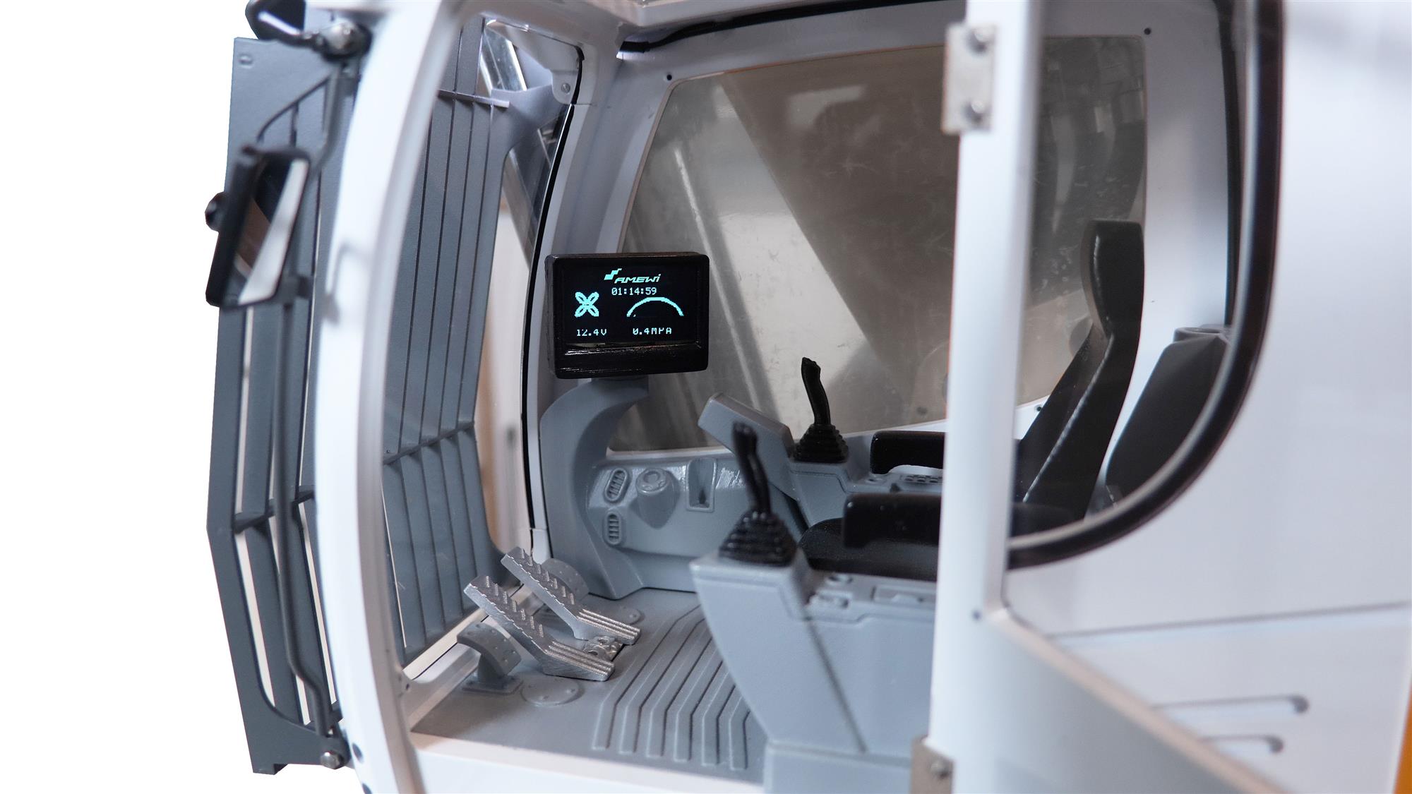 Ein Vollmetall-Kettenbagger der Superlative, der als RTR Modell und exklusive Amewi Edition mit einer bisher nicht gekannten Qualität im enormen Maßstab von 1:13,5 (gemessen) und 30,8kg Gewicht angeboten wird. Dieser Super Scale Nachbau eines 70t Baggers steht dem Original in nichts nach – alle Funktionen, alle Anbauteile und selbst der Cockpit-Ausbau sind bis ins kleinste Detail dem großen Bruder nachempfunden. In der Scale Kanzel ist sogar ein LCD-Display untergebracht, welches Echtzeit-Telemetriedaten wie Akkustand, Temperatur, Laufzeit und aktuellen Arbeitsdruck anzeigt. Letzterer beträgt dabei je nach Arbeitszustand bis zu 33bar. Bereits in der Herstellungsfabrik wurde der gesamte Hydraulik-Kreislauf auf Dichtigkeit mit ca. 60bar Druck geprüft.