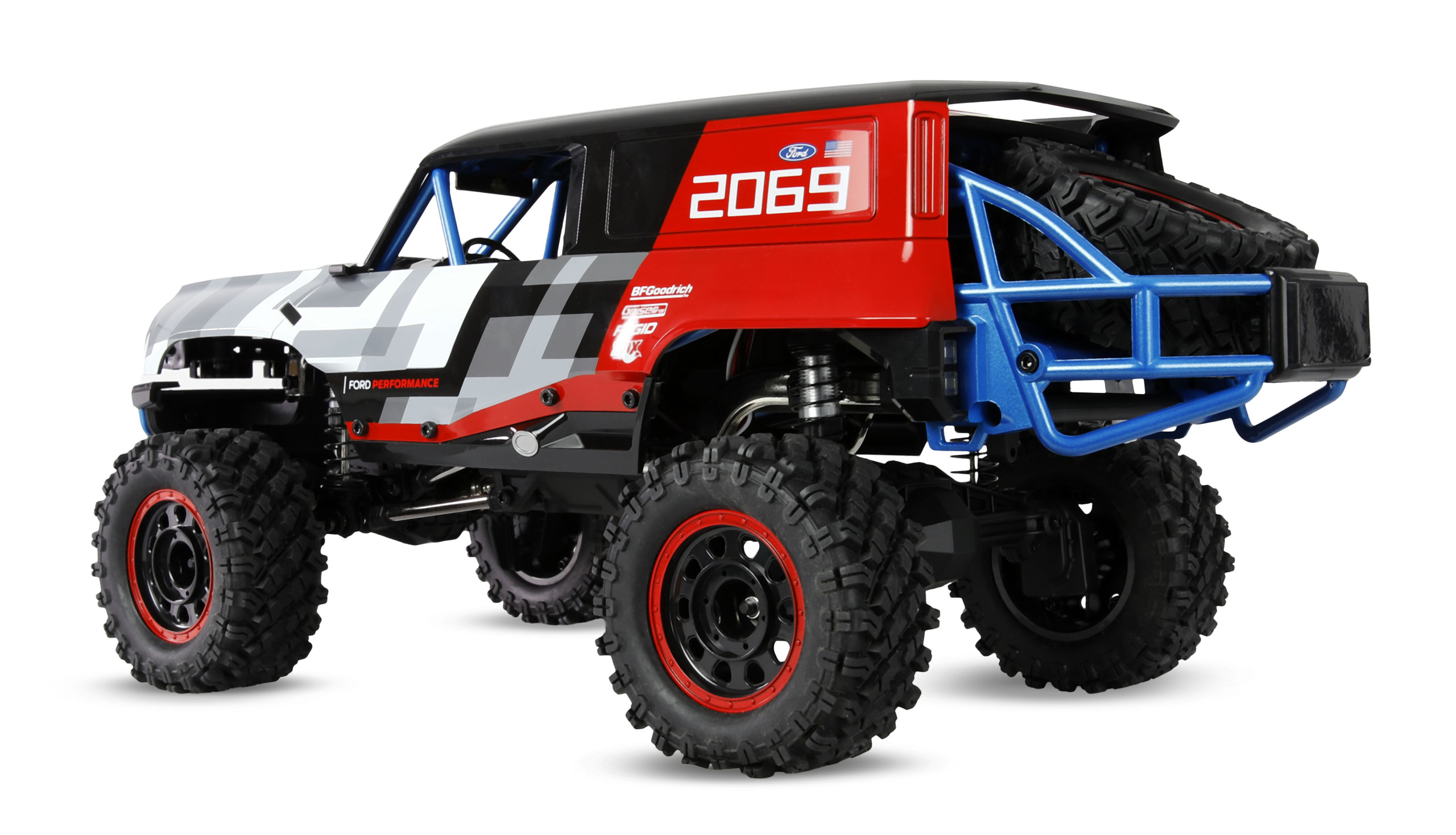 Das RTR-Set (Ready-to-Run) wird inklusive Fernsteuerung, Akku und Ladekabel geliefert und ist sofort einsatzbereit. Die Karosserie im lizenzierten Ford Bronco R Baja 1000 Design besteht aus strapazierfähigem ABS-Kunststoff und ist mit einem robusten Kunststoffkäfig sowie einem praktischen Magnetverschluss ausgestattet. Eine wasserdichte Empfängerbox schützt die Elektronik zuverlässig vor Feuchtigkeit. Für optimale Dämpfung sorgen Öldruck-Stoßdämpfer.