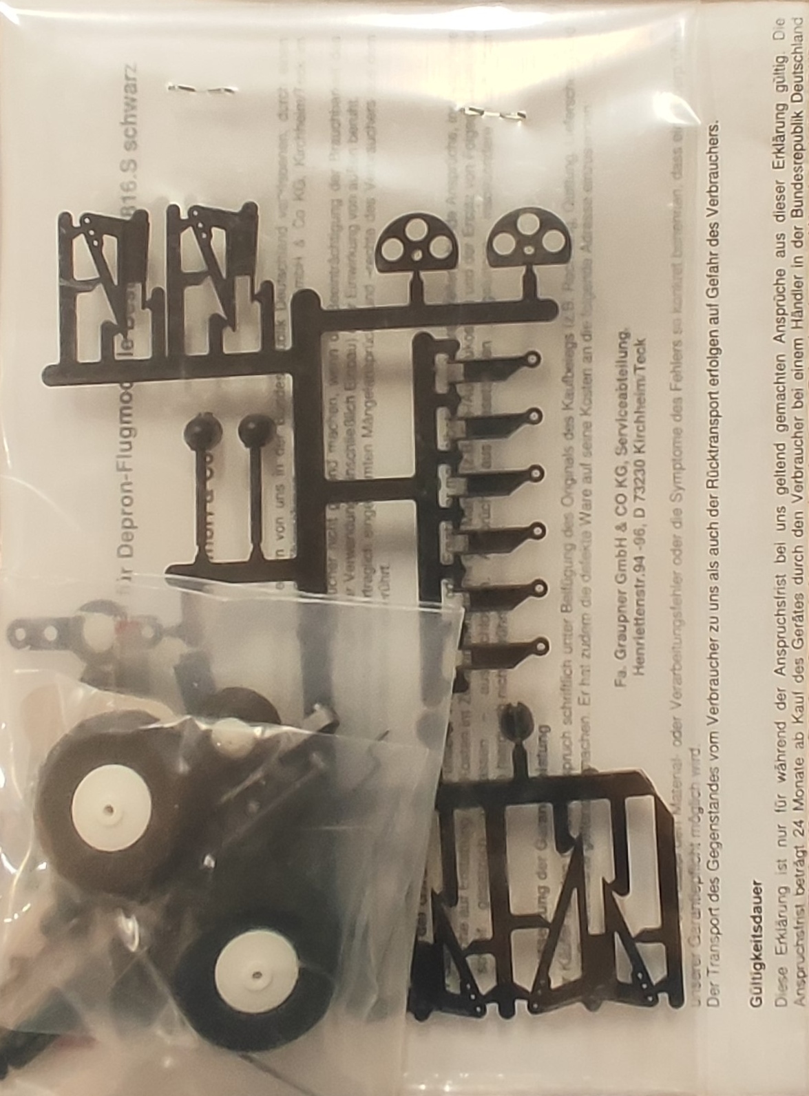Spritzteile aus schlagzähem ABS-Material, Ruderhörner mit Schnellklemmung für Anlenkschnur Mit 5 m Anlenkschnur, Moosgummileichträdern für Haupt- und Spornfahrwerk, Drahtgestänge fertig abgekröpft für Querruderanlenkung, Gummitüllen und Befestigungsschrauben für Motoraufnahme. Motoraufnahme zum Einstellen von Sturz und Zug, Spornraddrahtbügel für Spornrad, 4 Umlenkrollen für Seilanlenkung. Am Spritzbaum befinden sich: Ruderhörner einseitig (2 Stück), Ruderhörner beidseitig (3 Stück), Ruderhorn für Seitenruder mit Spornbefestigung, im Winkel einstellbare Radachsen (2 Stück), Radachsen-Befestigung (2 Stück), Radverkleidungsbefestigung (2 Stück), Motorbefestigung (3 Stück) Motorträgeradapter für COMPACT 160.