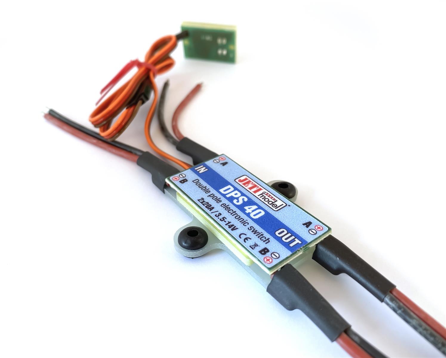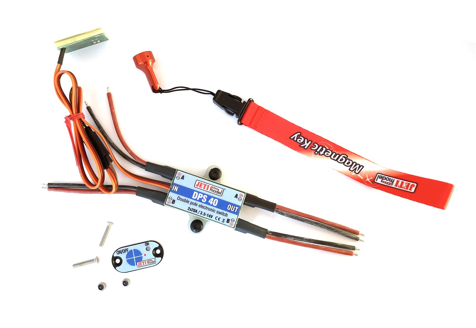 Die elektronischen Schalter DPS40 (doppelter elektronischer Schalter) und SPS20 (einfacher elektronischer Schalter) dienen vor allem zum Einschalten der Versorgungsspannung des Empfängers und der Servos. Der große Vorteil von elektronischen Schaltern im Vergleich zu mechanischen Schaltern besteht im allgemeinen in der höheren Zuverlässigkeit, Lebensdauer und Vibrationsunempfindlichkeit.
