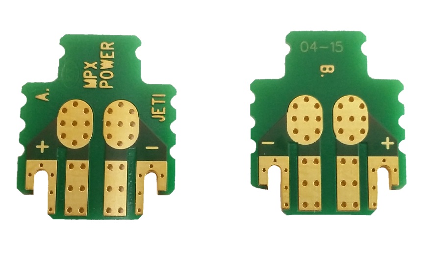 Platine für MPX Stecker oder Buchsen zum bequemen Anlöten von Hochstromkabeln 2×2 Lötkontakte (+/-)