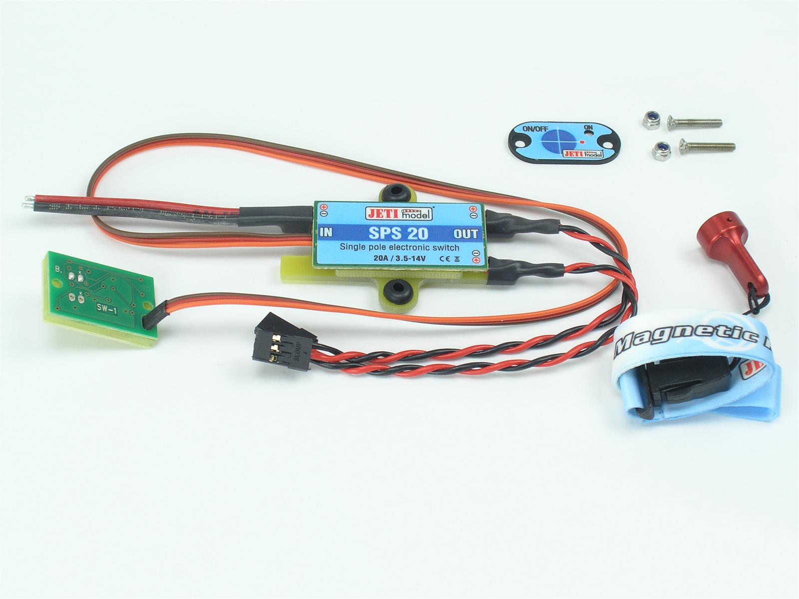 Die elektronischen Schalter DPS40 (doppelter elektronischer Schalter) und SPS20 (einfacher elektronischer Schalter) dienen vor allem zum Einschalten der Versorgungsspannung des Empfangers und der Servos. Der grose Vorteil von elektronischen Schaltern im Vergleich zu mechanischen Schaltern besteht im allgemeinen in der hoheren Zuverlassigkeit, Lebensdauer und Vibrationsunempfindlichkeit.