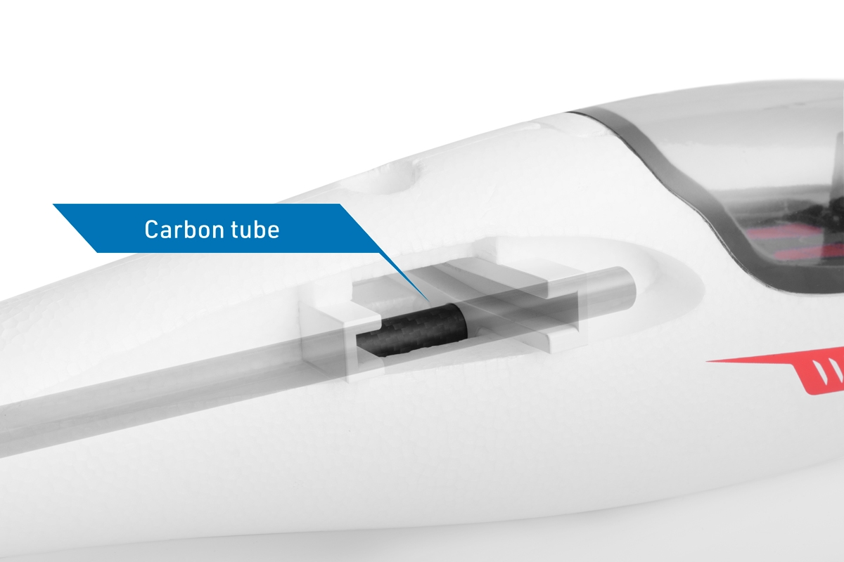 Die Leitwerke sind ebenfalls aus EPO-Schaum mit Verstärkungen aus Kohlefaser-Rohren. Das Höhenleitwerk wird mit zwei Schrauben an der Flosse befestigt und lässt sich leicht montieren und demontieren.