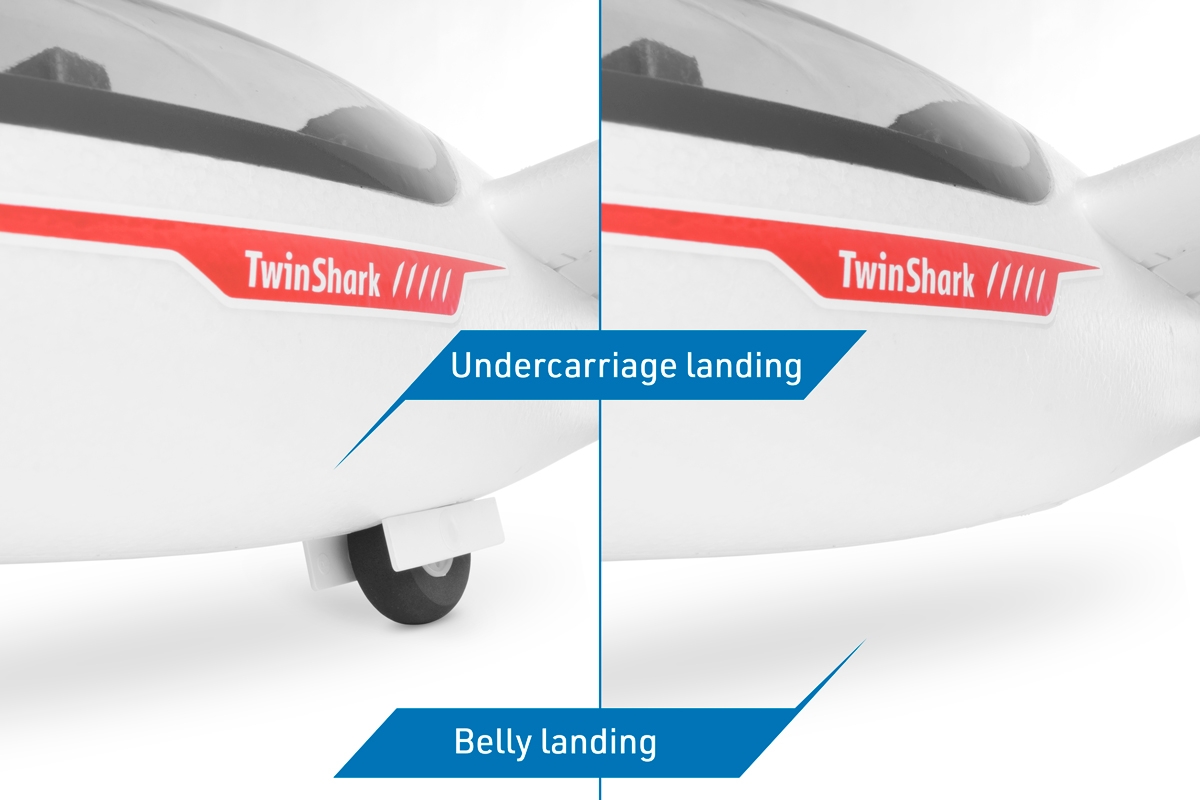 Natürlich ist es ideal, mindestens ein 7-Kanal-Computer-RC-Set zu verwenden, das die unabhängige Steuerung von Querrudern und Klappen durch zwei Servos und einen Mix für die Butterfly Bremse ermöglicht. Hierbei steuern beide Querruder nach oben und beide Klappen nach unten. Das ist möglich auch mit den erschwinglichen Sendern Futaba T6K und T10J. In diesem Fall müssen die Y-Kabel der Querruder und Klappen im Rumpf durch vier einzelne (15-30 cm) Verlängerungskabel ersetzt werden. In der Anleitung gibt es natürlich auch eine ausführliche Tabelle mit einer bewährten Standardeinstellung der Ruderausschläge (einschließlich Mixer), damit Sie Twin Shark einfach zum Flug vorbereiten, auch wenn es Ihr erster Segler mit „Vollmechanisierung“ des Flügels ist.