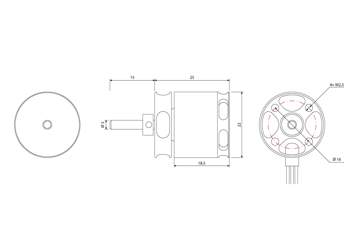 Motormontage: KAVAN PRO 2225-1600 ist nur für Frontmontage ausgelegt. Verwenden Sie mindestens zwei (gegenüberliegende) oder vier Schrauben M2,5, die Sie im Bereich von 3-4 mm in die Frontplatte des Motors eindrehen. Der Motorspant sollte aus 2 mm Sperrholz sein.