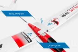 Der Flügel des Modells aus EPO-Schaum besteht aus zwei Teilen mit einer Kohlefaser-Leiste und einem Stahldraht-Verbinder. Zum Rumpf wird er mit zwei Kunststoffschrauben befestigt. Querruder werden unabhängig von zwei Servos mit kurzen geraden Drahtgestängen gesteuert.