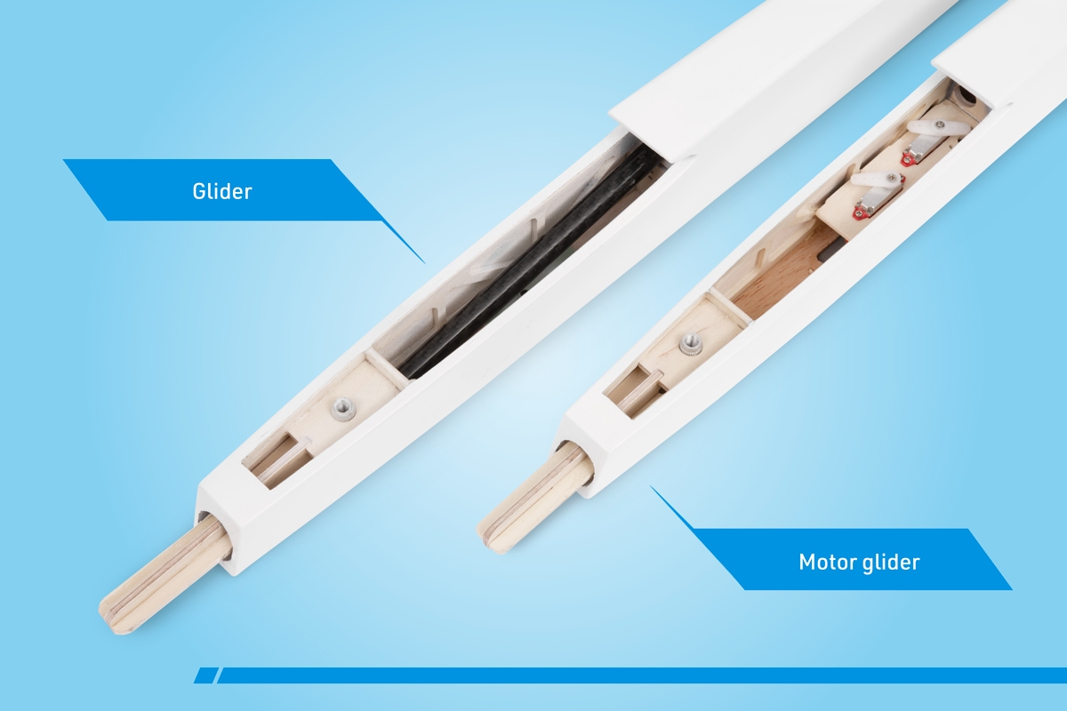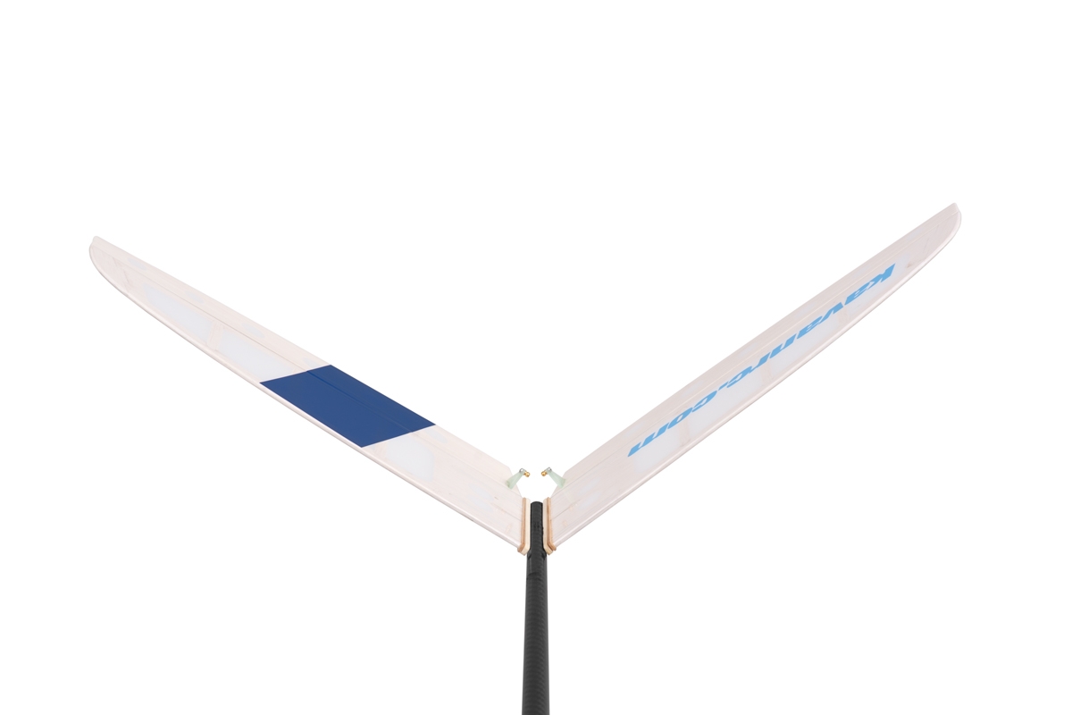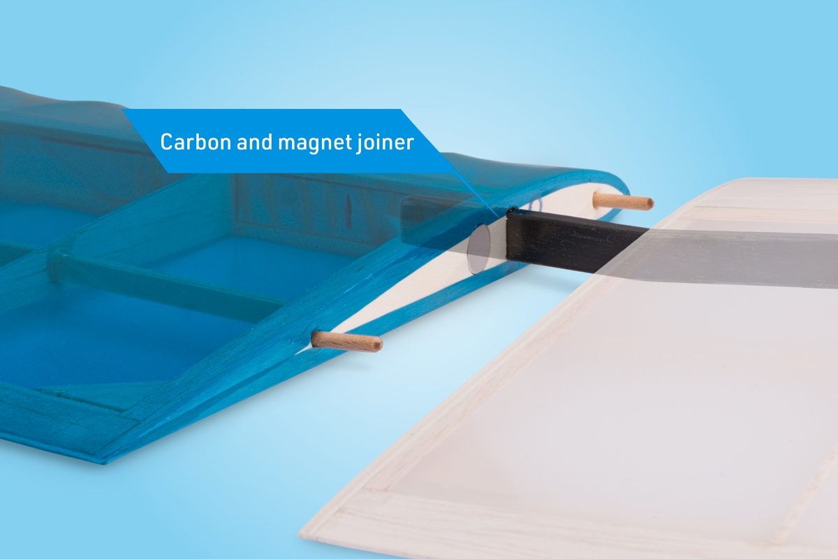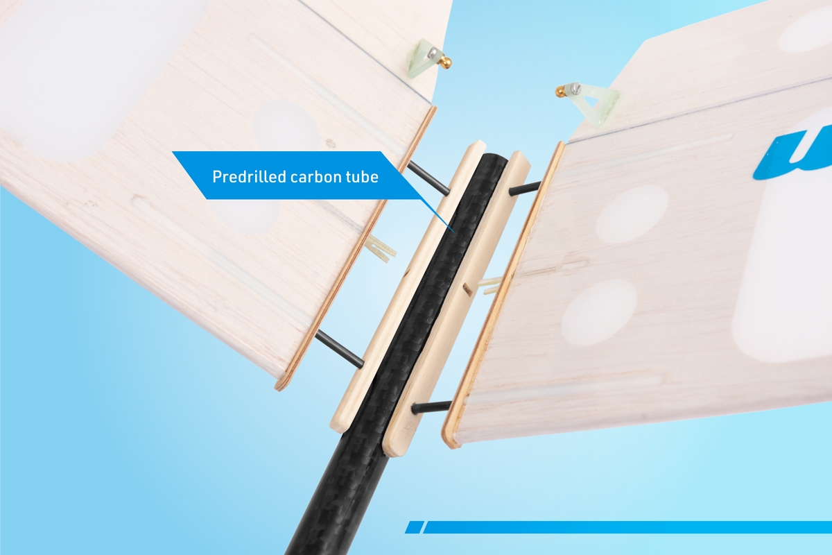 Der dreiteilige Flügel mit einem speziellen Profil HB RES hat eine klassische Konstruktion mit Balsarippen und mit einer festen Beplankung der D-Box in der Mitte. Der Hauptträger besteht aus Fichtenleisten-Streifen mit einer Balsa-Konstruktion, was eine hohe Festigkeit der Konstruktion bei einem sehr geringen Gewicht garantiert. Ohren mit eleganten Winglets schließen Sie an das Mittelteil mit Carbon-Verbindern und Buchenstiften mit Magneten als Sicherung an. In dem Mittelteil befindet sich eine zweiteilige Bremsklappe. – wir empfehlen, diese nicht wegzulassen, besonders wenn Sie einen „reinen“ Segler bauen. Gesteuert wird sie mit einem Servo mittels des Torsionsantriebs vom Kohlefaser-Stab mit Laminathebeln. Am Rumpf wird der Flügel mit Kunststoffschrauben befestigt.