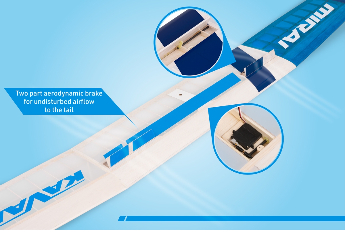 Der Baukasten des Hochleistungs-Thermik-Seglers mit der klassischen, sehr leichten Ganz-Balsa-Konstruktion, den Sie leicht auf den Antrieb mit einem 150-200 W Brushless-Motor umstellen können. MIRAI V ist ein ideales Projekt für Modellbauer, die ein wirklich leistungsstarkes Modell für Wettkampfflüge oder Hobbyfliegen möchten. Dank der ausgezeichneten Konstruktion mit CNC geschnittenen Teilen, die mit Einschnitten und Ausbuchtungen ausgestattet sind, die wie Teile eines Puzzles zusammenpassen, geht der Aufbau sehr schnell und einfach. MIRAI V ist ein Wettbewerbsmodell, mit dem Sie erfolgreich um ein „Siegerpodest“ in der Kategorie F3-RES oder F5-RES kämpfen können. Der Baukasten beinhaltet Rumpfteile für einen reinen Segler und auch ein Elektroflugmodell.