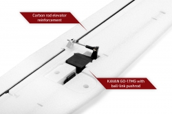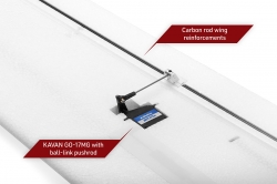The EPO foam fuselage, thoroughly carbon-reinforced, comes with the KAVAN C3548-750 brushless motor, 11×8” folding propeller and KAVAR R-50SB ESC featuring a powerful switching SBEC stabilizer necessary to feed all 4 high torque servos aboard. The detachable canopy is secured with a magnetic lock. The cockpit compartment offers a lot of space for your receiver and flight pack. The elevator and rudder servos are installed in the fin.