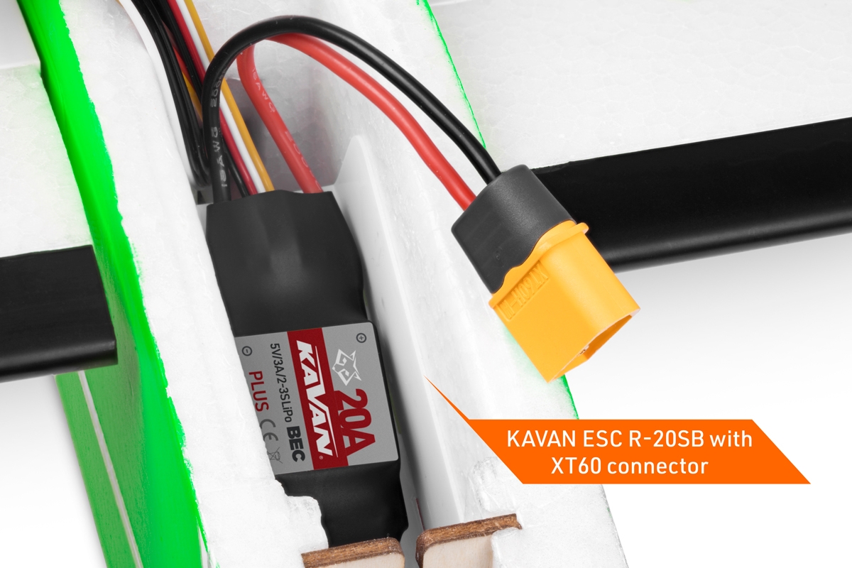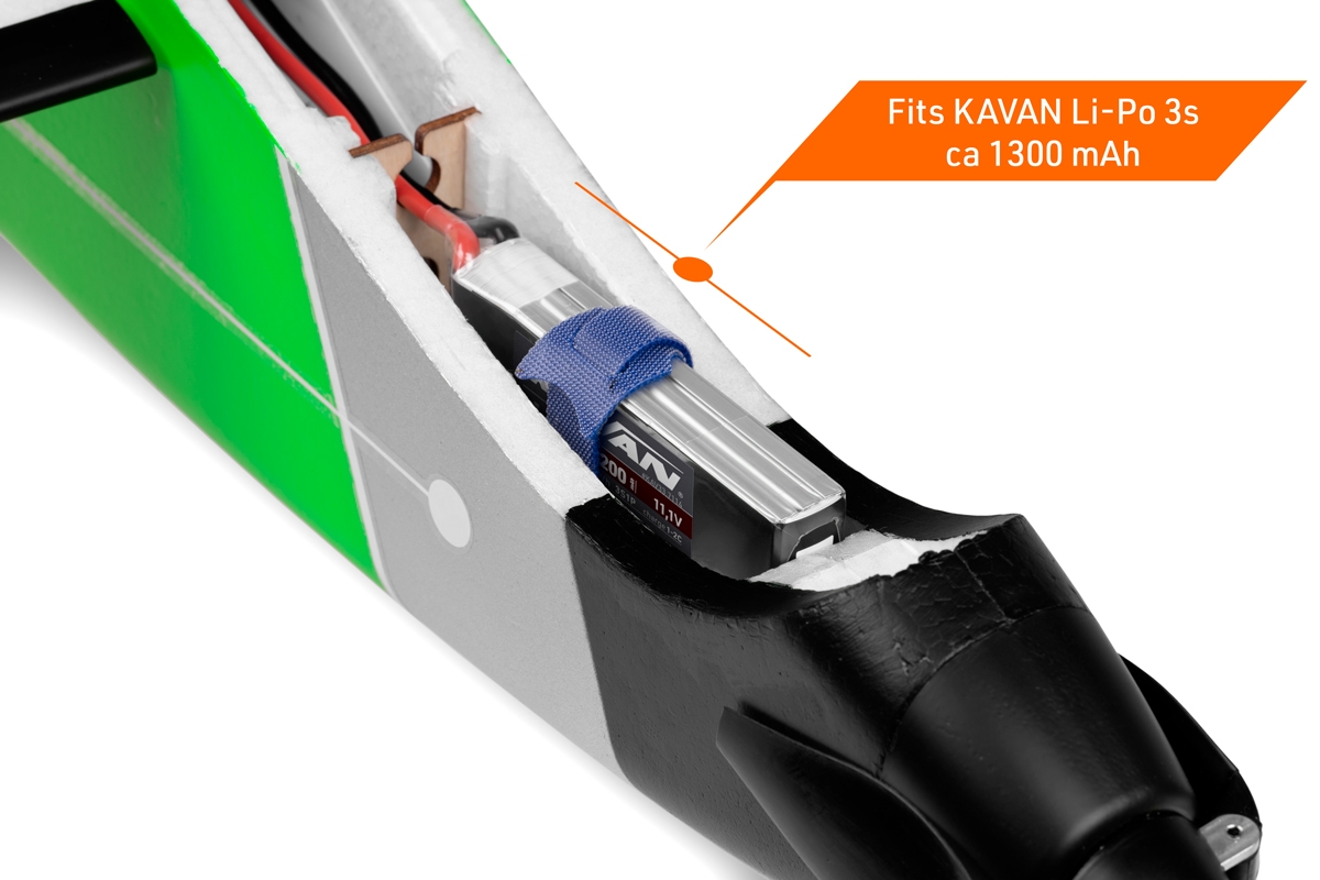 des Modells besteht aus dem hochbeständigen EPO-Schaum (extrudiertes Polyolefin) mit festen inneren Kohlefaser-Verstärkungen. Im Bug ist ein Brushless-Motor C2820-1450 mit einer Faltluftschraube 7×6“ und einem Regler KAVAN R-20SB Plus eingebaut. Die Kabinenabdeckung ist abnehmbar und ist vorne mit einem Stift und hinten mit einem mechanischen Verschluss befestigt. Im Bug finden Sie genug Platz für einen Antriebsakku und einen Empfänger. Im Raum unter der Tragfläche sind Mikroservos mit Metallgetriebe für die Steuerung der Flügelhälften, des Seiten- und Höhenruders untergebracht. Die Leitwerke werden über Bowdenzüge, die Tragflächenhälften über verstellbare Gestänge mit Kugelbolzen gesteuert.