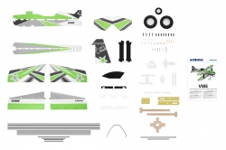 bedruckte Rumpf-, Flügel-, Leitwerksteile und Fahrwerkabdeckungen aus EPP-Schaum, eine Sperrholz-Motorbefestigung, 3D gedruckte Kunststoffteile, Kohlefaserverstärkungen, Hebel, Gabeln, Gestänge und weiteres Kleinteile-Zubehör, Kohlefaser-Fahrwerk mit leichten Rädern, eine ausführliche Bauanleitung mit Abbildungen.