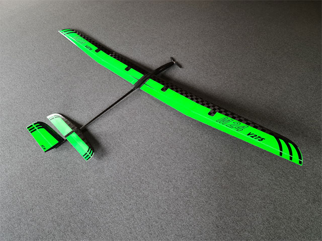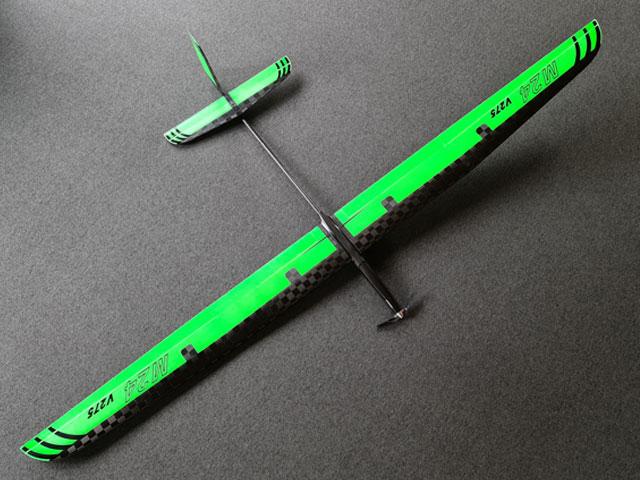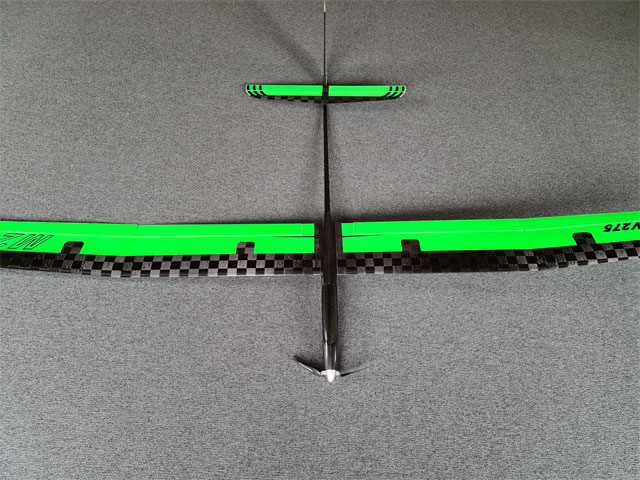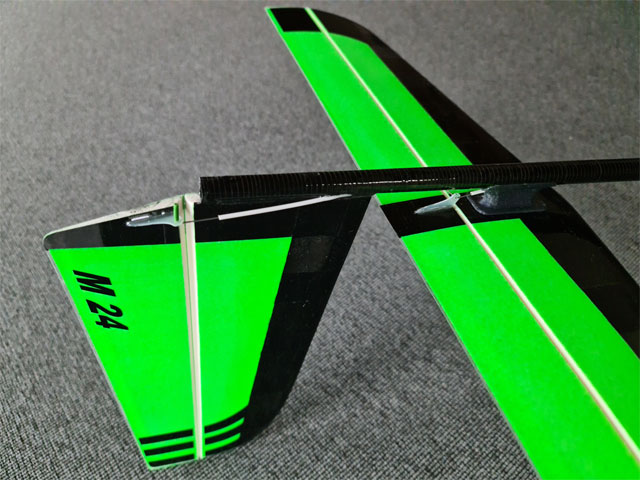 Das Leergewicht des M24 V275 beträgt gerade mal 560g bei einer Spannweite von 2.75m. In der Plug & Play Version wiegt er flugbereit 850g. Das ergibt eine Flächenbelastung von ca. 17.5g/dm2. Die Flügel sind aus leichtem XPS-extrudiertem Polystyrol hergestellt, das mit hochwertigem Glasgewebe in einem Winkel von 45° belegt ist. Dies ergibt eine gute Torsionssteifigkeit. Carbon-Verstrebungen in den Flügeln, der Höhe und dem Seitenleitwerk sorgen für eine hervorragende Biegesteifigkeit.
