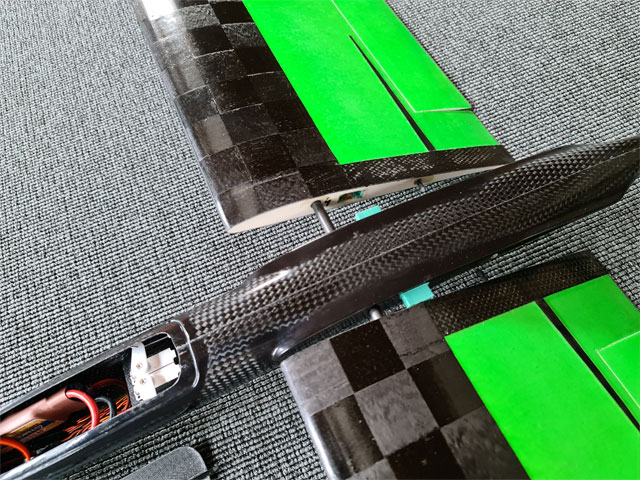 Anstelle von den 4 Flächenschrauben, werden die beiden Flächen nun von Links und Rechts auf den Verbinder aufgeschoben, welcher davor durch die Öffnung im Rumpf gesteckt wurde. Die fix in der Fläche und Rumpf eingeklebten MPX Stecker machen beim Zusammenbau automatisch die Verbindung für die beiden Flächenservos. Die beiden Flächen werden mit einem Klebestreifen vor dem Herausrutschen gesichert.