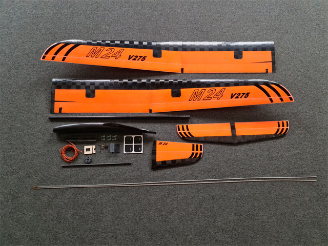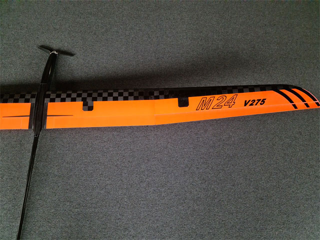 Das Leergewicht des M24 V275 beträgt gerade mal 560g bei einer Spannweite von 2.75m. In der Plug & Play Version wiegt er flugbereit 850g. Das ergibt eine Flächenbelastung von ca. 17.5g/dm2. Die Flügel sind aus leichtem XPS-extrudiertem Polystyrol hergestellt, das mit hochwertigem Glasgewebe in einem Winkel von 45° belegt ist. Dies ergibt eine gute Torsionssteifigkeit. Carbon-Verstrebungen in den Flügeln, der Höhe und dem Seitenleitwerk sorgen für eine hervorragende Biegesteifigkeit.