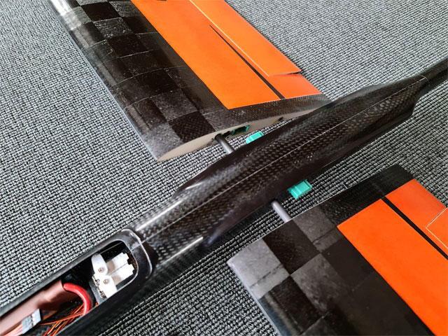 Anstelle von den 4 Flächenschrauben, werden die beiden Flächen nun von Links und Rechts auf den Verbinder aufgeschoben, welcher davor durch die Öffnung im Rumpf gesteckt wurde. Die fix in der Fläche und Rumpf eingeklebten MPX Stecker machen beim Zusammenbau automatisch die Verbindung für die beiden Flächenservos. Die beiden Flächen werden mit einem Klebestreifen vor dem Herausrutschen gesichert.