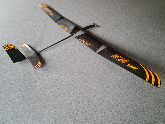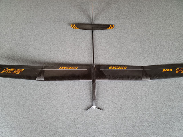 Das Leergewicht des M24 V275 beträgt gerade mal 560g bei einer Spannweite von 2.75m. In der Plug & Play Version wiegt er flugbereit 850g. Das ergibt eine Flächenbelastung von ca. 17.5g/dm2. Die Flügel sind aus leichtem XPS-extrudiertem Polystyrol hergestellt, das mit hochwertigem Glasgewebe in einem Winkel von 45° belegt ist. Dies ergibt eine gute Torsionssteifigkeit. Carbon-Verstrebungen in den Flügeln, der Höhe und dem Seitenleitwerk sorgen für eine hervorragende Biegesteifigkeit.