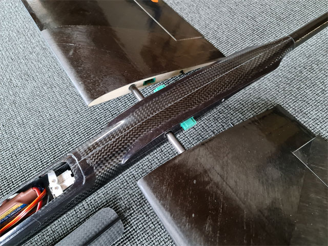 Anstelle von den 4 Flächenschrauben, werden die beiden Flächen nun von Links und Rechts auf den Verbinder aufgeschoben, welcher davor durch die Öffnung im Rumpf gesteckt wurde. Die fix in der Fläche und Rumpf eingeklebten MPX Stecker machen beim Zusammenbau automatisch die Verbindung für die beiden Flächenservos. Die beiden Flächen werden mit einem Klebestreifen vor dem Herausrutschen gesichert.