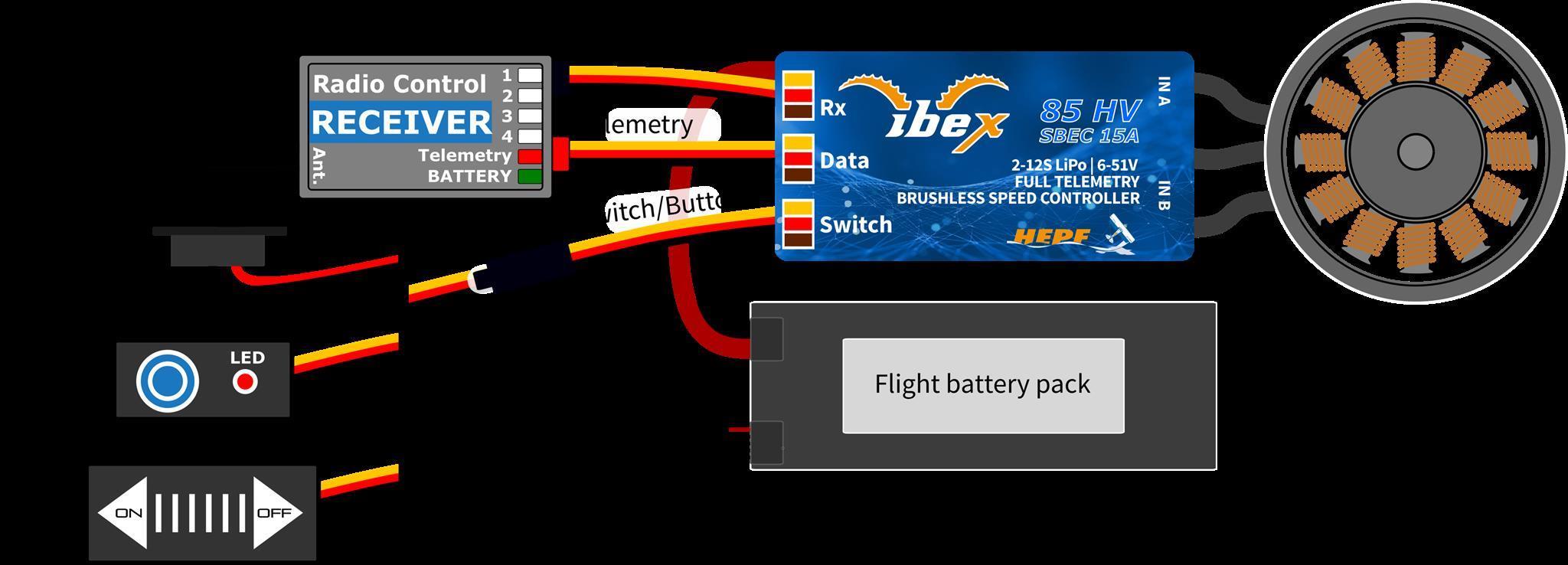 Der Ibex BEC Controller ermöglicht es Ihnen, bei Bedarf einen externen Schalter zu verwenden. Standardmäßig ist der Schalter nicht vorhanden, sodass sich der Fahrtregler/BEC sofort nach dem Anschließen des Flugakkus einschaltet.