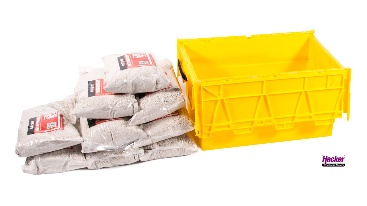 Die Akkus werden auf und zwischen die mit Extover® Brandschutz Feuerlöschgranulat gefüllten Löschmittelbeutel gelegt und auch damit abgedeckt, so dass kein Verrutschen möglich ist. Die Gefahrgutbox wird geschlossen und mit dem Gurt gesichert.