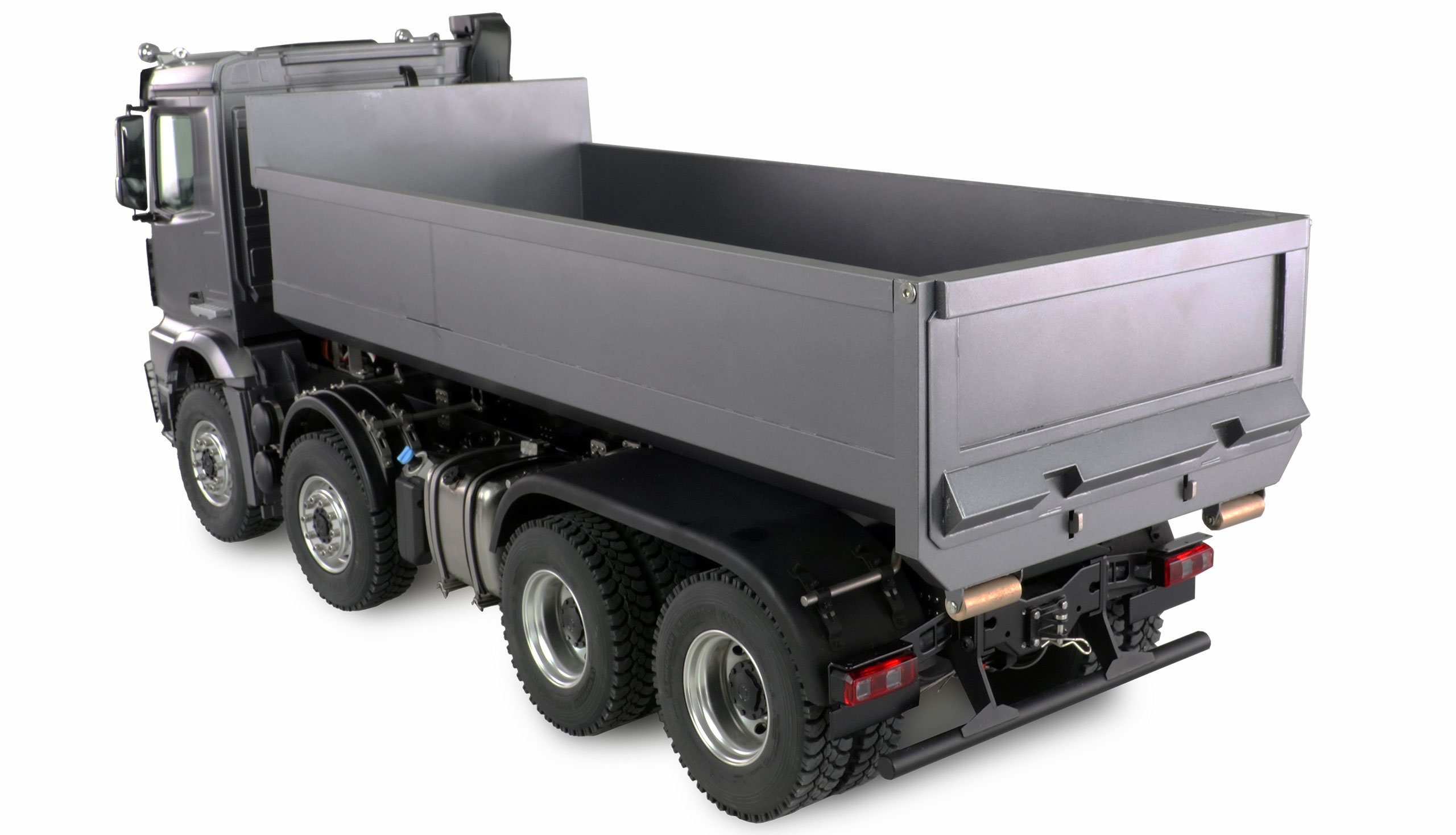 Der gesamte 8×8 Antrieb des Fahrzeugs ist aus Metall gefertigt, genauso wie beispielsweise das Chassis, die Mulde, die Anbauteile, der Tank, die Felgen. Die Hinterachsen sind mit einer profilierten Zwillingsbereifung ausgestattet, die beiden lenkbaren Vorderachsen mit einfachem Profil. Als Federung dient hier eine Blattfederung und die Hinterachsen sind als Pendelachse ausgelegt.
