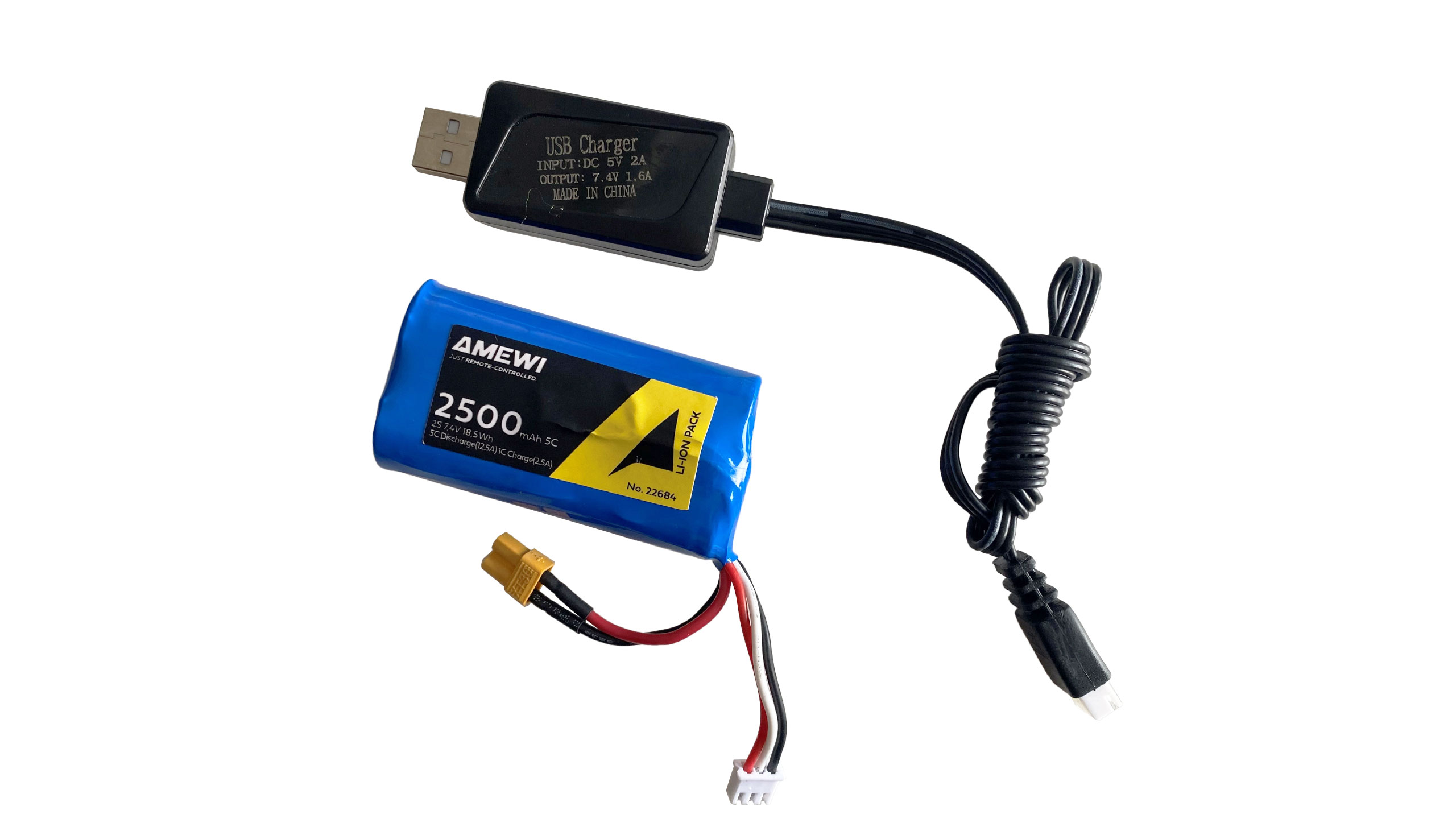 Für eine Fahrzeit von bis zu 25 Minuten sorgt der mitgelieferte 2500mAh Li-Ion-Akku mit XT30-Anschluss. Die ebenfalls enthaltene 2,4GHz-Fernsteuerung ermöglicht eine präzise, proportionale Steuerung aller Funktionen. Ein passendes Ladekabel für den Antriebsakku ist ebenfalls im Lieferumfang enthalten.