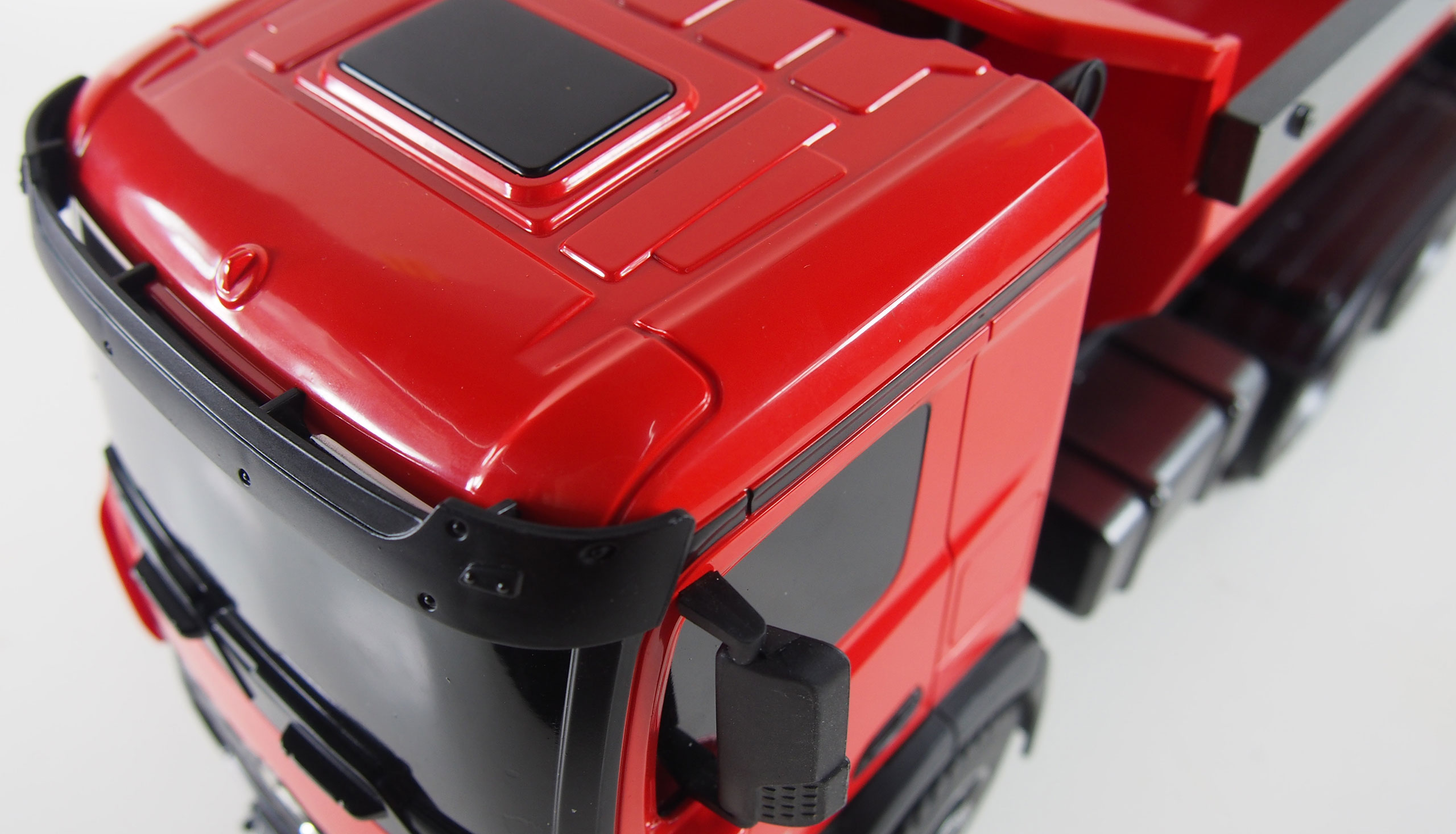 Tolles Original Mercedes-Benz Scale Modell eines Arocs Kippers.Arocs ist die Bezeichnung der berühmten LKW Baureihe der Marke Mercedes-Benz der Daimler AG. Die Arocs Baustellenfahrzeuge wurden erstmalig 2013 vorgestellt und sind seitdem auf vielen Baustellen weltweit zu finden. Leistungsstärke, Zuverlässigkeit und Robustheit zeichnen sie aus. Bei diesem lizenziertem Modell lassen sich fast alle Funktionen wie beim großen Bruders ansteuern und dadurch die Herzen der Scaler Fans höher schlagen. Das Modell verfügt über einen 4WD Antrieb und ein gekapseltes Getriebe.Es ist daher vor Spritzwasser geschützt und somit auch geländetauglich. Der Aufbau und die Lackierung entsprechen bei diesem hochwertigen Modell dem Original, das macht dieses Modell in Ausführung und Darstellung besonders. Das Modell wird RTR (ready to run) ausgeliefert und der Lieferumfang beinhaltet alles, was für den Betrieb erforderlich ist. (außer die Batterien für den Sender)FeaturesOriginal Lizensiertes Mercedes-Benz Modell10 Kanäle steuerbar2,4GHz System (störungssicher)Funktionen: vorwärts / rückwärts / rechts links, Sound an / aus, Licht, Mulde separat steuerbarlange Fahrzeit (bis zu 20 min.)Akku enthalten (Ni-MH 7,2V 400mAh)Ladegerät enthaltenSender enthaltenoriginalgetreue Simulation aller FunktionenTechnische Daten:Länge: 422mmBreite: 152mmHöhe: 181mmGewicht: 2600gFahrzeit bis zu 20min (je nach Fahrstil)Ladezeit ca. 1,5 Std.Reichweite: ca. 30mUSB LadekabelAkku: 7,2V 400mAh Ni-Mh BEC AnschlussLieferumfang:Modell Arocs KipperSender 2,4GhzAkku 7,2V 400mAh Ni-MhLadegerät USBAnleitung: Deu / Eng / Ita / FraBenötigtes Zubehör4x AA Mignon Batterie für Sender 1,5V geeignet ab 8 Jahren