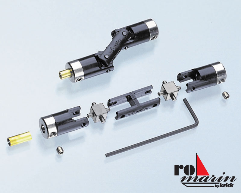 Doppel-Kreuzgelenkkupplung für Schiffsantriebe. Wellenversatz-Ausgleich ca. 2 mm. Aus hochschlagzähem, selbstschmierendem Delrin hergestellt. Die eingespritzten MS-Buchsen sind beidseitig für 4 mm-Wellen ausgelegt. Durch Einsetzen der beiliegenden Distanzhülse können auch Wellen von 3 und 3,2 mm angeschlossen werden. Die Kupplung wird auf jeder Seite mit einer Madenschraube auf der Welle fixiert. Lieferung mit Sechskantschlüssel 1,5 mm.