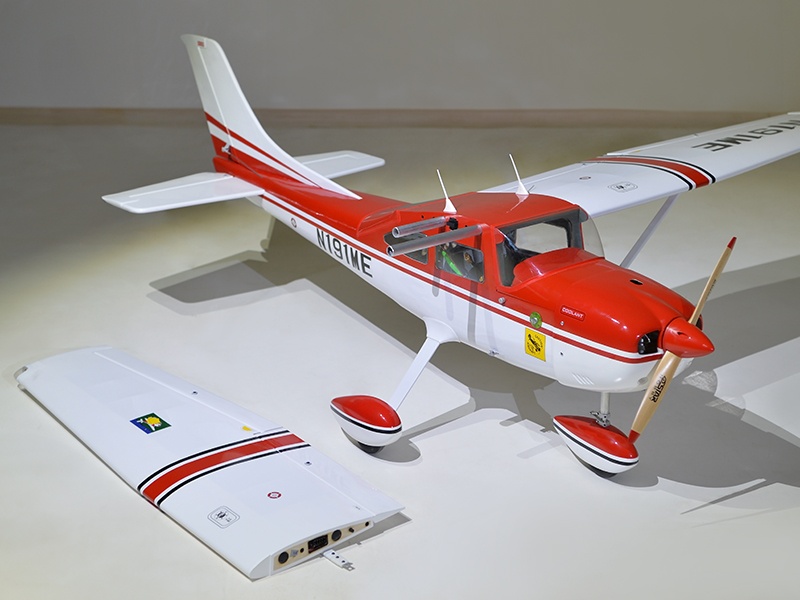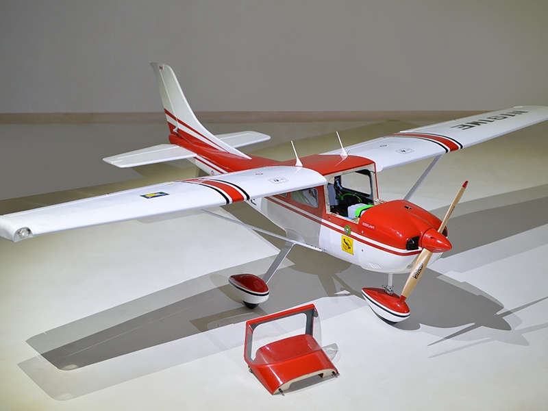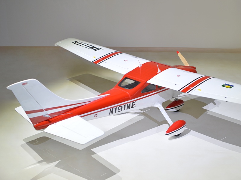 Holzkonstruktion mit enorm hohen Vorfertigungsgrad Das Modell ist in extrem leichter und hochfester Balsa-/Sperrholzbauweise gefertigt. Dabei besticht die lasergeschnittene Konstruktion durch einen enorm hohen Vorfertigungsgrad, wodurch sich der Bauaufwand nahezu auf den Einbau von Antrieb und Elektronik reduziert. Unter der abnehmbaren Kabine befindet sich viel Platz für den Einbau der Elektronik. Die Cessna 182 ist komplett fertig mit Folie bespannt.