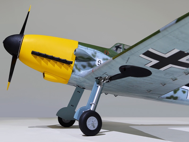 Das Modell ist in extrem leichter und hochfester Balsa-/Sperrholzbauweise gefertigt. Dabei besticht die lasergeschnittene Konstruktion durch einen enorm hohen Vorfertigungsgrad, wodurch sich der Bauaufwand nahezu auf den Einbau von Antrieb und Elektronik reduziert. Unter der abnehmbaren Kabinenhaube befindet sich viel Platz für den Einbau der Elektronik. Die Bf 109 ist komplett fertig mit Folie bespannt.