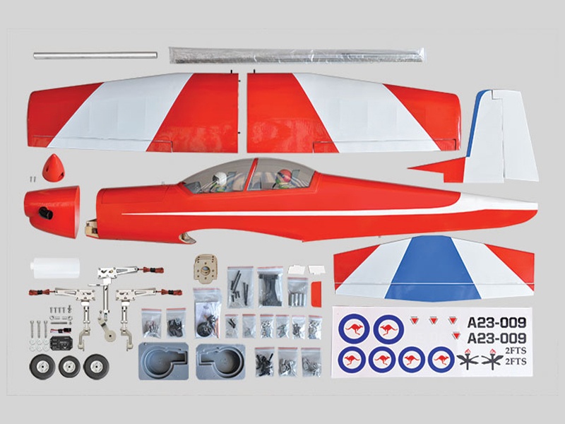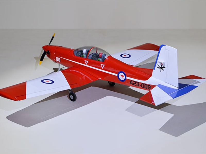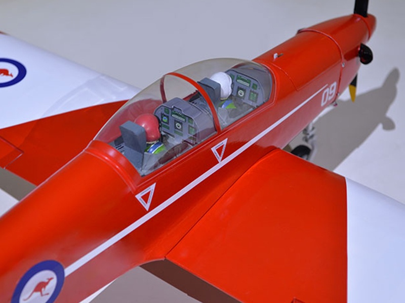 Holzkonstruktion mit enorm hohen Vorfertigungsgrad Das Modell ist in extrem leichter und hochfester Balsa-/Sperrholzbauweise gefertigt. Dabei besticht die lasergeschnittene Konstruktion durch einen enorm hohen Vorfertigungsgrad, wodurch sich der Bauaufwand nahezu auf den Einbau von Antrieb und Elektronik reduziert. Unter der abnehmbaren Kabinenhaube befindet sich viel Platz für den Einbau der Elektronik. Die PC-9 Pilatus ist komplett fertig mit Folie bespannt.