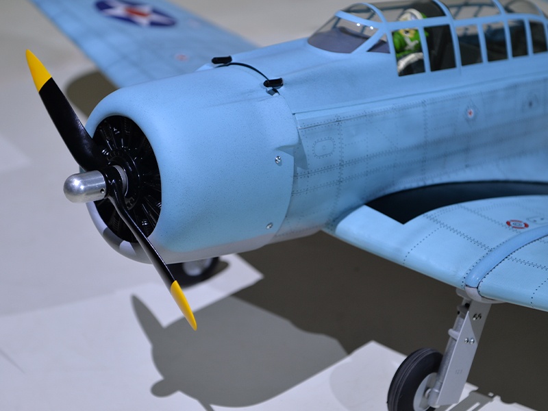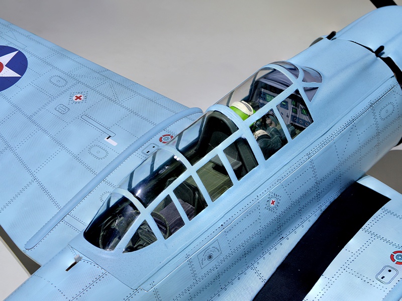 Das Modell ist in extrem leichter und hochfester Balsa-/Sperrholzbauweise gefertigt. Dabei besticht die lasergeschnittene Konstruktion durch einen enorm hohen Vorfertigungsgrad, wodurch sich der Bauaufwand nahezu auf den Einbau von Antrieb und Elektronik reduziert. Unter der abnehmbaren Kabinenhaube befindet sich viel Platz für den Einbau der Elektronik. Die SBD Dauntless ist komplett fertig mit Folie bespannt.