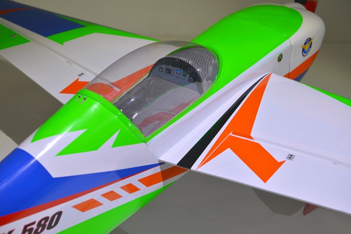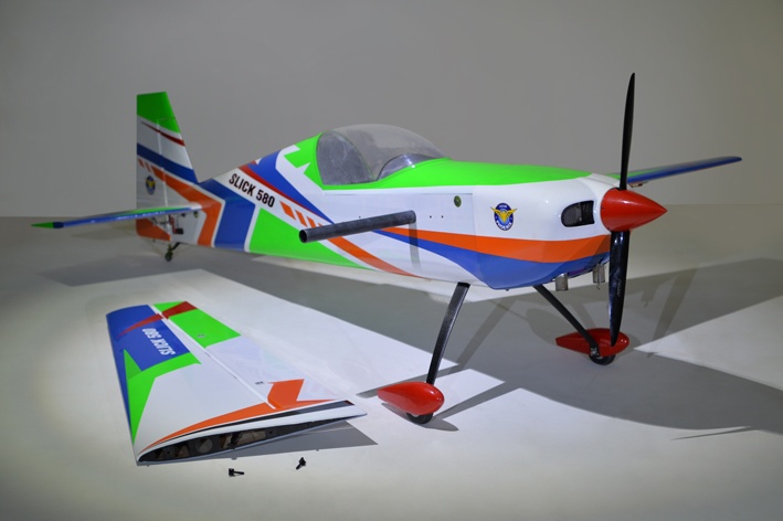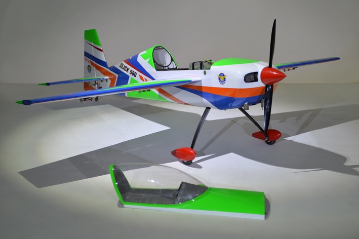 Das Modell ist in extrem leichter und verstärkter Holzbauweise gefertigt. Dabei besticht die lasergeschnittene Konstruktion durch einen enorm hohen Vorfertigungsgrad, wodurch sich der Bauaufwand nahezu auf den Einbau von Antrieb und Elektronik reduziert. Unter der großen abnehmbaren GFK-Kabinenhaube befindet sich viel Platz für den Einbau der Elektronik. Die Slick 580 ist komplett fertig mit Folie bespannt.